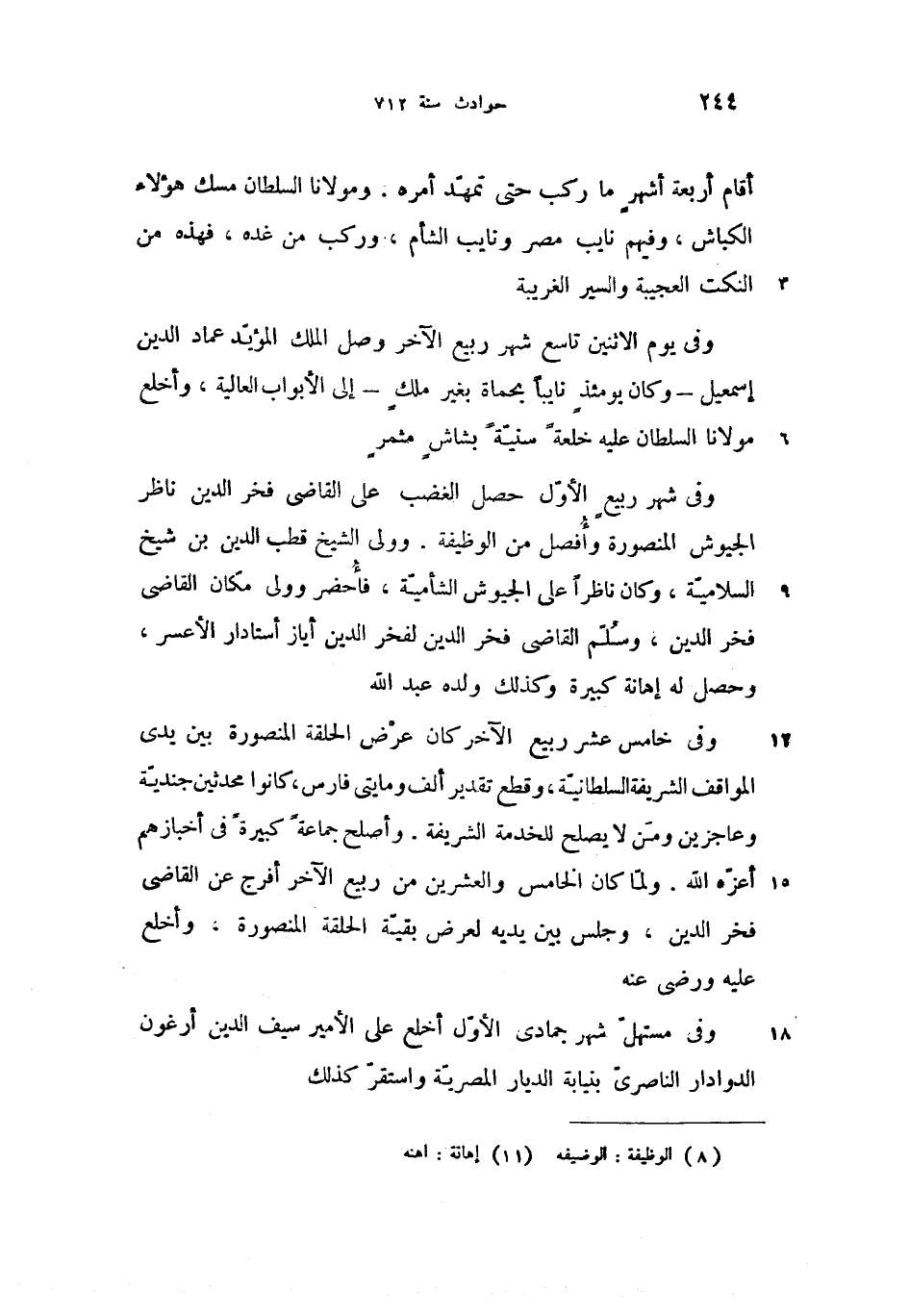وفى شهر ربيع الأوّل حصل الغضب على القاضى فخر الدين ناظر الجيوش المنصورة وأفصل من الوظيفة (8). وولى الشيخ قطب الدين بن شيخ السلاميّة، وكان ناظرا على الجيوش الشأميّة، فأحضر وولى مكان القاضى فخر الدين، وسلّم القاضى فخر الدين لفخر الدين أياز أستادار الأعسر، وحصل له إهانة (11) كبيرة وكذلك ولده عبد الله