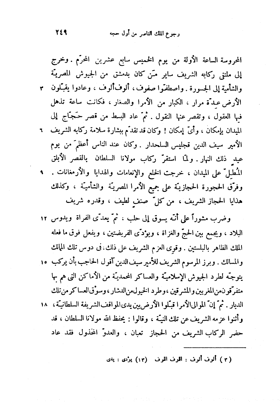 وضرب مشورا على أنّه يسوق إلى حلب، ثمّ يعدّى الفراة ويدوس البلاد، ويجمع بين الحجّ والغزاة، ويؤدّى (13) الفريضتين، ويفعل فوق ما فعله الملك الظاهر بالبلستين. وقوى العزم الشريف على ذلك، فى دوس تلك الممالك والمسالك. وبرز المرسوم الشريف للأمير سيف الدين آقول الحاجب بأن يركب يتوجّه لطرد الجيوش الإسلاميّة والعساكر المحمديّة من الأماكن التى هم بها متفرّقون من المغربين والمشرقين، وطرد الخيول من الدشار، وسوق العساكر من تلك الديار. ثمّ إنّ الموالى الأمرا قبّلوا الأرض بين يدى المواقف الشريفة السلطانيّة، وأثنوا عزمه الشريف عن تلك النيّة، وقالوا: يحفظ الله مولانا السلطان، قد حضر الركاب الشريف من الحجاز تعبان، والعدوّ المخذول فقد عاد