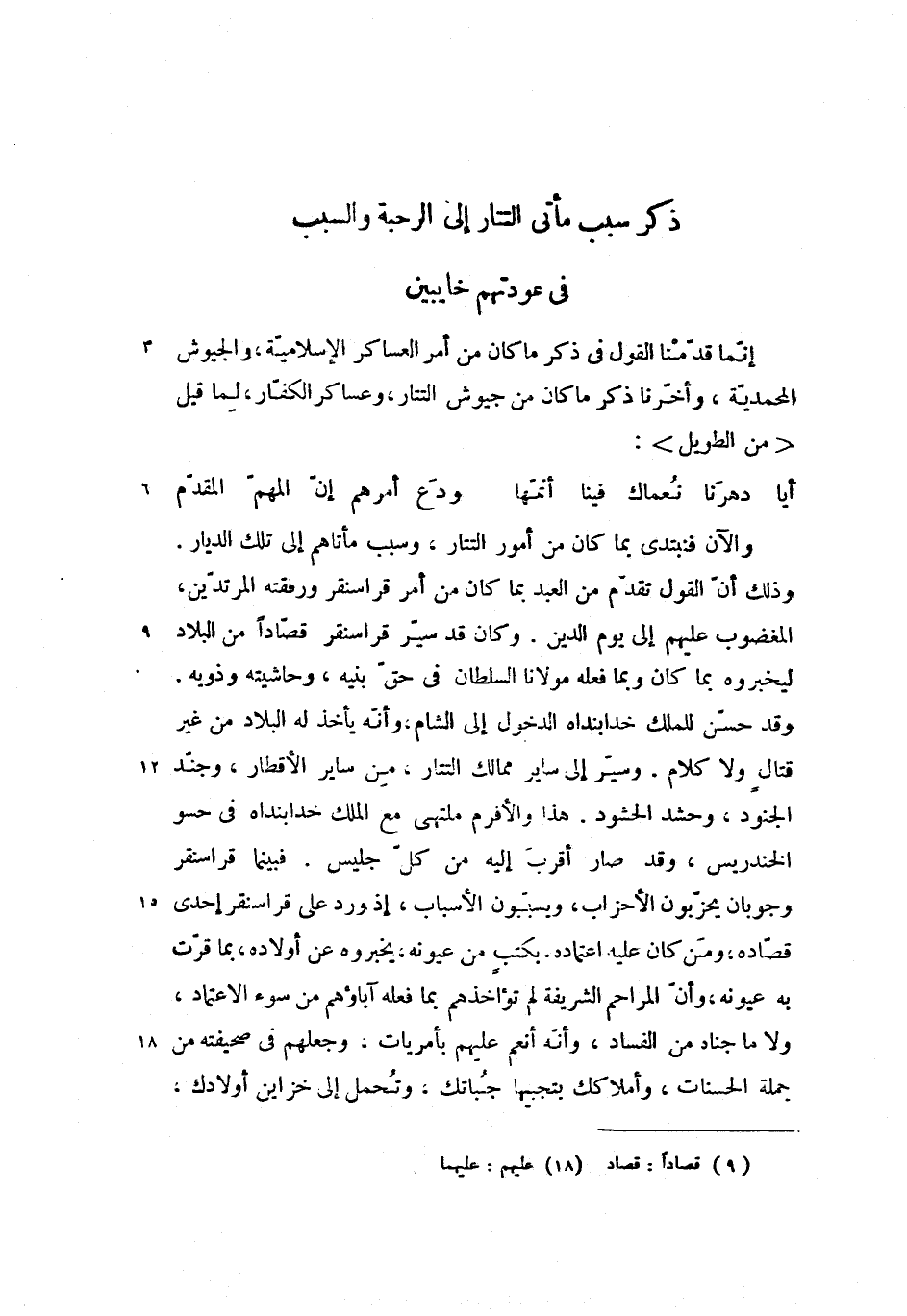 إنّما قدّمنا القول فى ذكر ما كان من أمر العساكر الإسلاميّة، والجيوش المحمديّة، وأخّرنا ذكر ما كان من جيوش التتار، وعساكر الكفّار، لما قبل <من الطويل>: