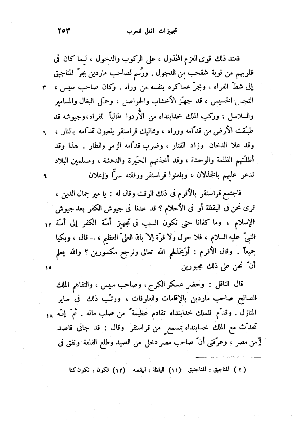 فاجتمع قراسنقر بالأفرم فى ذلك الوقت وقال له: يامير جمال الدين، ترى نحن فى اليقظة (11) أو فى الأحلام؟ قد عدنا فى جيوش الكفر بعد جيوش الإسلام، وما كفانا حتى نكون (12) السبب فى تجهيز أمّة الكفر إلى أمّة النبىّ عليه السلام، فلا حول ولا قوّة إلاّ بالله العلىّ العظيم، -قال، وبكيا جميعا. وقال الأفرم: أو يخذلهم الله تعالى ونرجع مكسورين؟ والله يعلم أنّ نحن على ذلك مجبورين