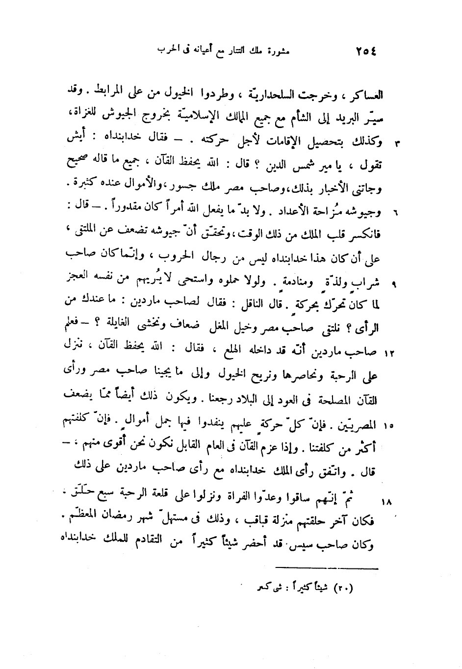 فانكسر قلب الملك من ذلك الوقت، وتحقّق أنّ جيوشه تضعف عن الملتقى، على أن كان هذا خدابنداه ليس من رجال الحروب، وإنّما كان صاحب شراب ولذّة ومنادمة. ولولا حملوه واستحى لا يريهم من نفسه العجز لما كان تحرّك بحركة. قال الناقل: فقال لصاحب ماردين: ما عندك من الرأى؟ نلتقى صاحب مصر وخيل المغل ضعاف ونخشى الغايلة؟ -فعلم صاحب ماردين أنّه قد داخله الهلع، فقال: الله يحفظ القآن، ننزل على الرحبة ونحاصرها ونريح الخيول وإلى ما يجينا صاحب مصر ورأى القآن المصلحة فى العود إلى البلاد رجعنا. ويكون ذلك أيضا ممّا يضعف المصريّين. فإنّ كلّ حركة عليهم ينفدوا فيها جمل أموال. فإنّ كلفتهم أكثر من كلفتنا. وإذا عزم القآن فى العام القابل نكون نحن أقوى منهم. - قال. واتّفق رأى الملك خدابنداه مع رأى صاحب ماردين على ذلك