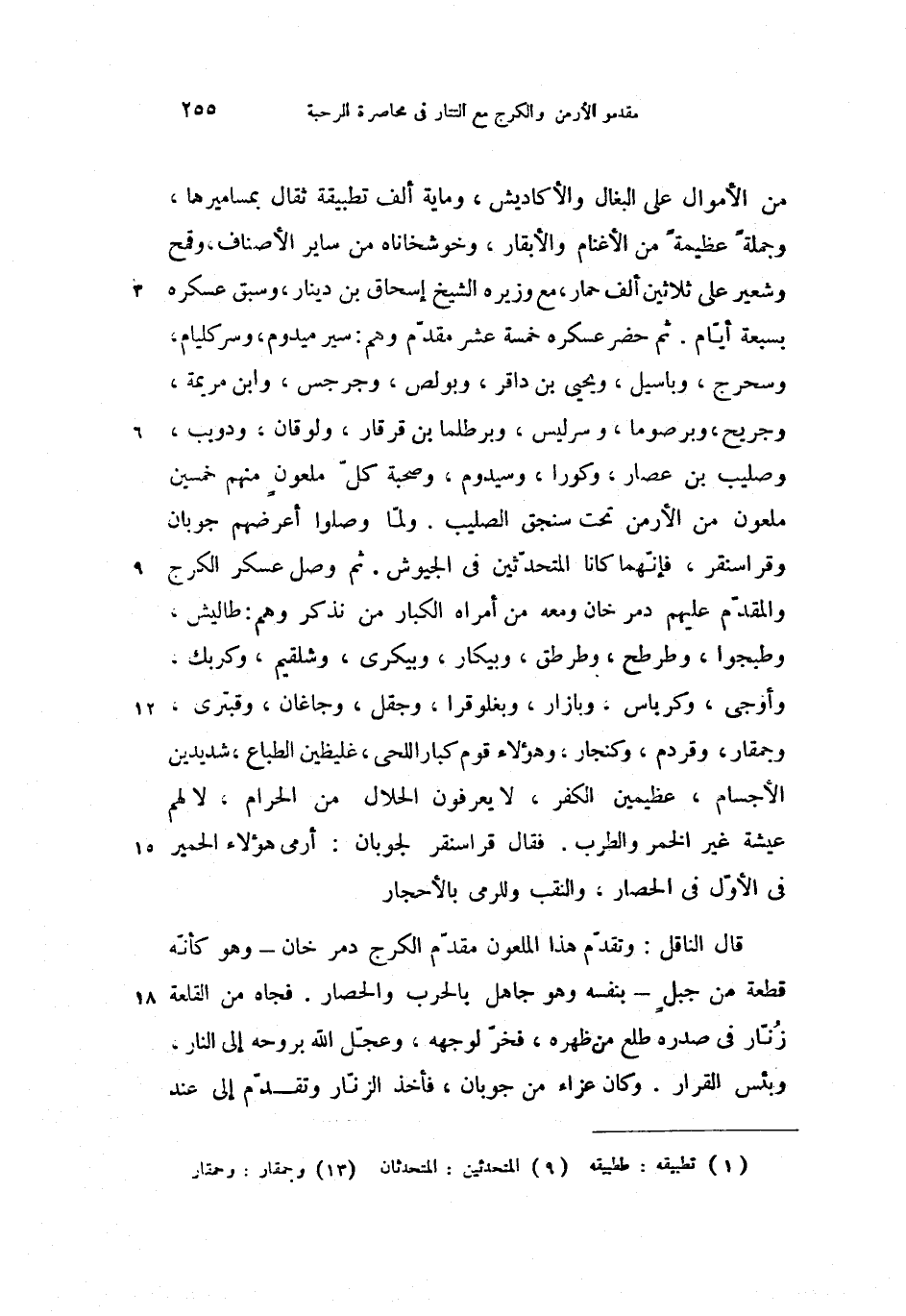 وأوجى، وكرباس، وبازار، وبغلوقرا، وجقل، وجاغان، وقبترى، وجمقار (13)، وقردم، وكنجار، وهؤلاء قوم كبار اللحى، غليظين الطباع، شديدين الأجسام، عظيمين الكفر، لا يعرفون الحلال من الحرام، لا لهم عيشة غير الخمر والطرب. فقال قراسنقر لجوبان: أرمى هؤلاء الحمير فى الأوّل فى الحصار، والنقب وللرمى بالأحجار