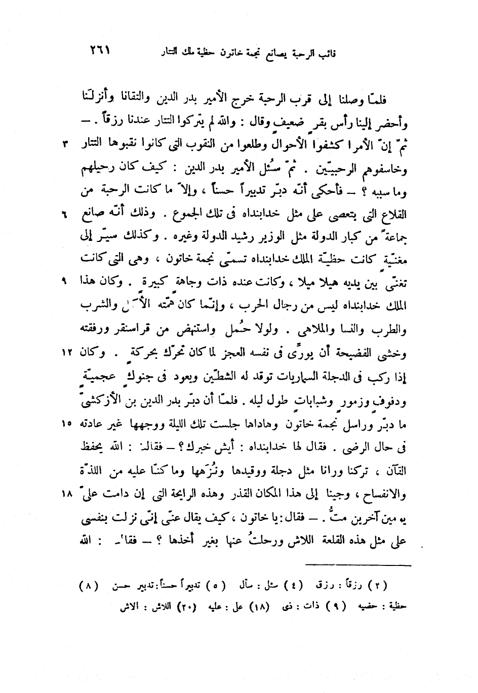 فلمّا وصلنا إلى قرب الرحبة خرج الأمير بدر الدين والتقانا وأنزلنا وأحضر إلينا رأس بقر ضعيف وقال: والله لم يتركوا التتار عندنا رزقا (2). - ثمّ إنّ الأمرا كشفوا الأحوال وطلعوا من النقوب التى كانوا نقبوها التتار وخاسفوهم الرحبيّين. ثمّ سئل (4) الأمير بدر الدين: كيف كان رحيلهم وما سببه؟ -فأحكى أنّه دبّر تدبيرا حسنا (5)، وإلاّ ما كانت الرحبة من القلاع التى بتعصى على مثل خدابنداه فى تلك الجموع. وذلك أنّه صانع جماعة من كبار الدولة مثل الوزير رشيد الدولة وغيره. وكذلك سيّر إلى مغنيّة كانت حظيّة (8) الملك خدابنداه تسمّى نجمة خاتون، وهى التى كانت تغنّى بين يديه هيلا ميلا، وكانت عنده ذات (9) وجاهة كبيرة. وكان هذا الملك خدابنداه ليس من رجال الحرب، وإنّما كان همّته الأكل والشرب والطرب والنساء والملاهى. ولولا حمل واستنهض من قراسنقر ورفقته وخشى الفضيحة أن يورّى فى نفسه العجز لما كان تحرّك بحركة. وكان إذا ركب فى الدجلة السماريات توقد له الشطّين ويعود فى جنوك عجميّة ودفوف وزمور وشبابات طول ليله. فلمّا أن دبّر بدر الدين بن الأزكشىّ ما دبّر وراسل نجمة خاتون وهاداها جلست تلك الليلة ووجهها غير عادته فى حال الرضى. فقال لها خدابنداه: أيش خبرك؟ -فقالت: الله يحفظ القآن، تركنا ورانا مثل دجلة ووقيدها ونزهها وما كنّا عليه من اللذّة والانفساح، وجينا إلى هذا المكان القذر وهذه الرايحة التى إن دامت علىّ (18) يومين آخرين متّ. -فقال: يا خاتون، كيف يقال عنّى إنّى نزلت بنفسى على مثل هذه القلعة اللاش (20) ورحلت عنها بغير أخذها؟ -فقال: الله