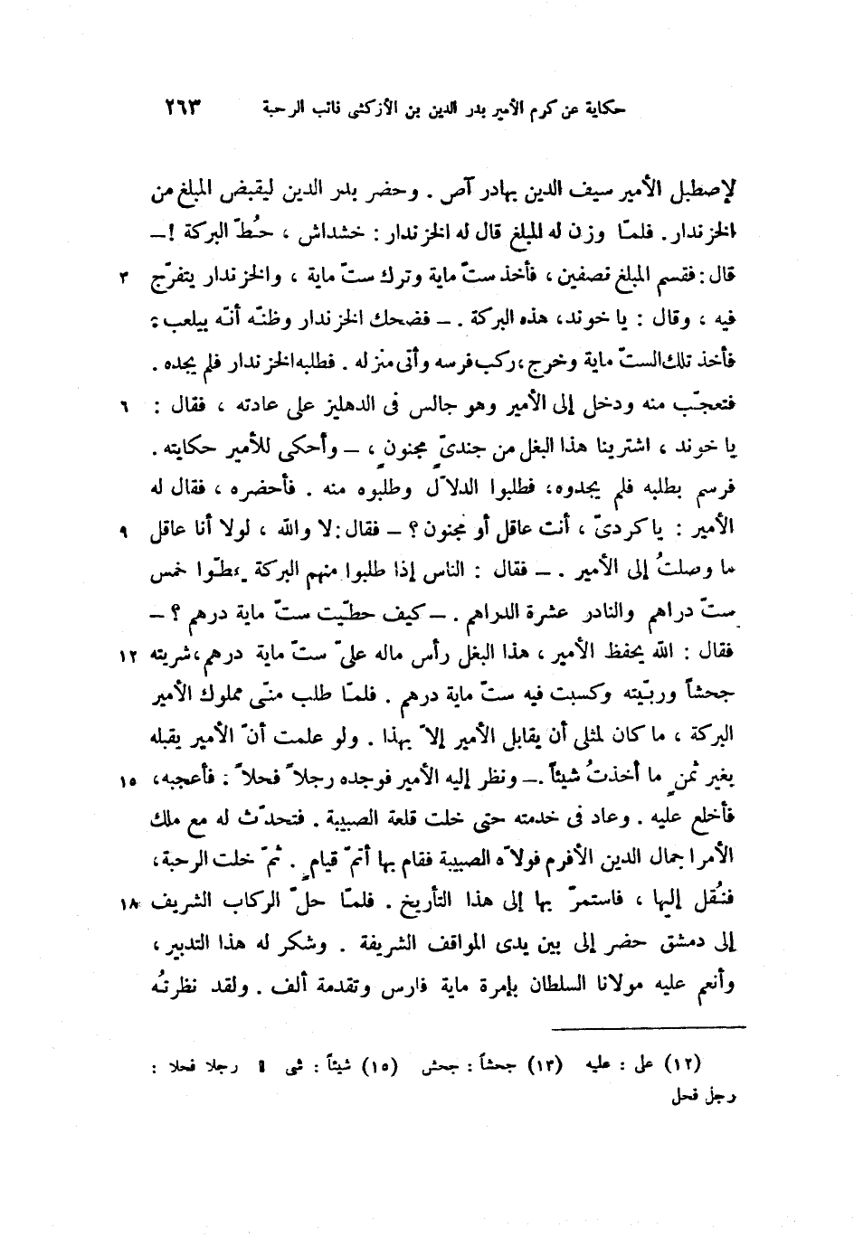فرسم بطلبه فلم يجدوه، فطلبوا الدلاّل وطلبوه الدلاّل وطلبوه منه. فأحضره، فقال له الأمير: يا كردىّ، أنت عاقل أو مجنون؟ -فقال: لا والله، لولا أنا عاقل ما وصلت إلى الأمير. -فقال: الناس إذا طلبوا منهم البركة يطّوا خمس ستّ دراهم والنادر عشرة الدراهم. -كيف حطّيت ستّ ماية درهم؟ - فقال: الله يحفظ الأمير، هذا البغل رأس ماله علىّ (12) ستّ ماية درهم، شريته جحشا (13) وربّيته وكسبت فيه ستّ ماية درهم. فلمّا طلب منّى مملوك الأمير البركة، ما كان لمثلى أن يقابل الأمير إلاّ بهذا. ولو علمت أنّ الأمير يقبله بغير ثمن ما أخذت شيئا (15). -ونظر إليه الأمير فوجده رجلا فحلا. فأعجبه، فأخلع عليه. وعاد فى خدمته حتى خلت قلعة الصبيبة. فتحدّث له مع ملك الأمرا جمال الدين الأفرم فولاّه الصبيبة فقام بها أتمّ قيام. ثمّ خلت الرحبة، فنقل إليها، فاستمرّ بها إلى هذا التأريخ. فلمّا حلّ الركاب الشريف إلى دمشق حضر إلى بين يدى المواقف الشريفة. وشكر له هذا التدبير، وأنعم عليه مولانا السلطان بإمرة ماية فارس وتقدمة ألف. ولقد نظرته