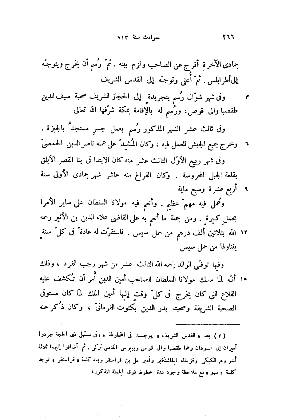 (2) بعد «القدس الشريف» يوجد فى المخطوطة «وفى مستهل ذى الحجة جردوا أميران إلى السودان وهما طقصبا والى قوص وبيبرس الخاص تركى. ثم أضافوا إليهما ثلاثة أخر وهم الكبكى وقزلجاه الجاشنكير وأمير على بن قراسنقر وبعد كلمة «قراسنقر» توجد كلمة «سهو» مع ملاحظة وجود عدة خطوط فوق الجملة المذكورة