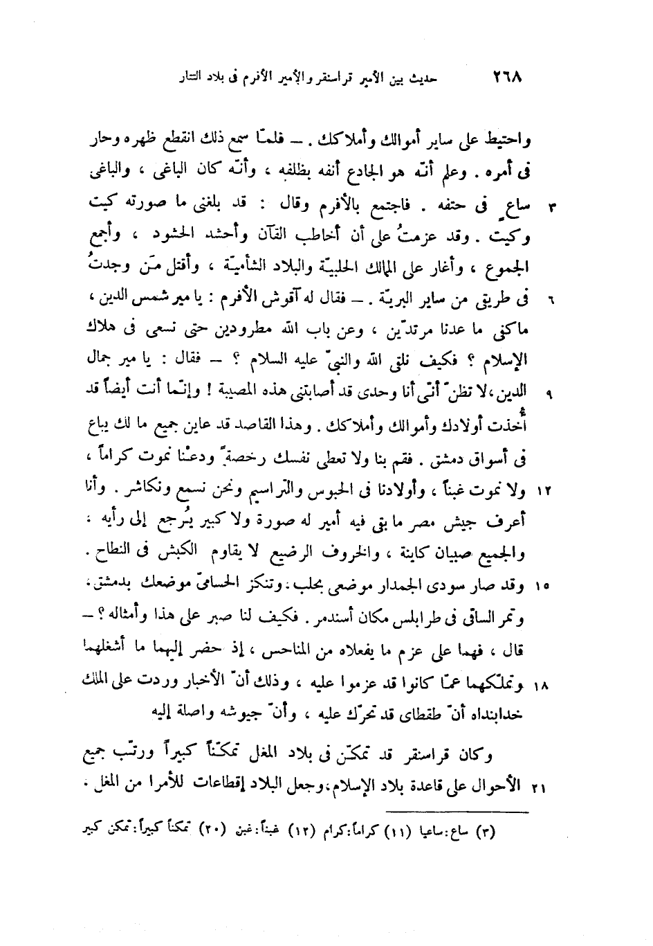 واحتيط على ساير أموالك وأملاكك. -فلمّا سمع ذلك انقطع ظهره وحار فى أمره. وعلم أنّه هو الجادع أنفه بظلفه، وأنّه كان الباغى، والباغى ساع (3) فى حتفه. فاجتمع بالأفرم وقال: قد بلغنى ما صورته كيت وكيت. وقد عزمت على أن أخاطب القآن وأحشد الحشود، وأجمع الجموع، وأغار على الممالك الحلبيّة والبلاد الشأميّة، وأقتل من وجدت فى طريقى من ساير البريّة. -فقال له آقوش الأفرم: يامير شمس الدين، ما كفى ما عدنا مرتدّين، وعن باب الله مطرودين حتى نسعى فى هلاك الإسلام؟ فكيف نلقى الله والنبىّ عليه السلام؟ -فقال: يامير جمال الدين، لا تظنّ أنّى أنا وحدى قد أصابتنى هذه المصيبة! وإنّما أنت أيضا قد أخذت أولادك وأموالك وأملاكك. وهذا القاصد قد عاين جميع ما لك يباع فى أسواق دمشق. فقم بنا ولا تعطى نفسك رخصة ودعنا نموت كراما (11)، ولا نموت غبنا (12)، وأولادنا فى الحبوس والتراسيم ونحن نسمع ونكاشر. وأنا أعرف جيش مصر ما بقى فيه أمير له صورة ولا كبير يرجع إلى رأيه، والجميع صبيان كاينة، والخروف الرضيع لا يقاوم الكبش فى النطاح.