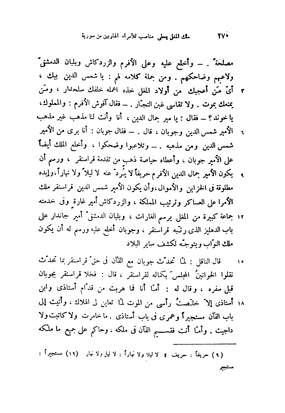 قال الناقل: لمّا تحدّث جوبان مع القآن فى حقّ قراسنقر بما تحدّث نقلوا الخواتين المجلس بكماله لقراسنقر، قال: فخلا قراسنقر بجوبان قبل سفره، وقال له: أمّا أنا فما هربت من قدّام أستاذى وابن أستاذى إلاّ خلّصت رأسى من الموت لمّا تعاين لى الهلاك، وأتيت إلى باب القآن مستجيرا (19) وعمرى فى باب أستاذى. ما خامرت ولا كاتبت ولا داجيت. وأمّا أنت فقسيم القآن فى ملكه، وحاكم على جميع ما ملّكه