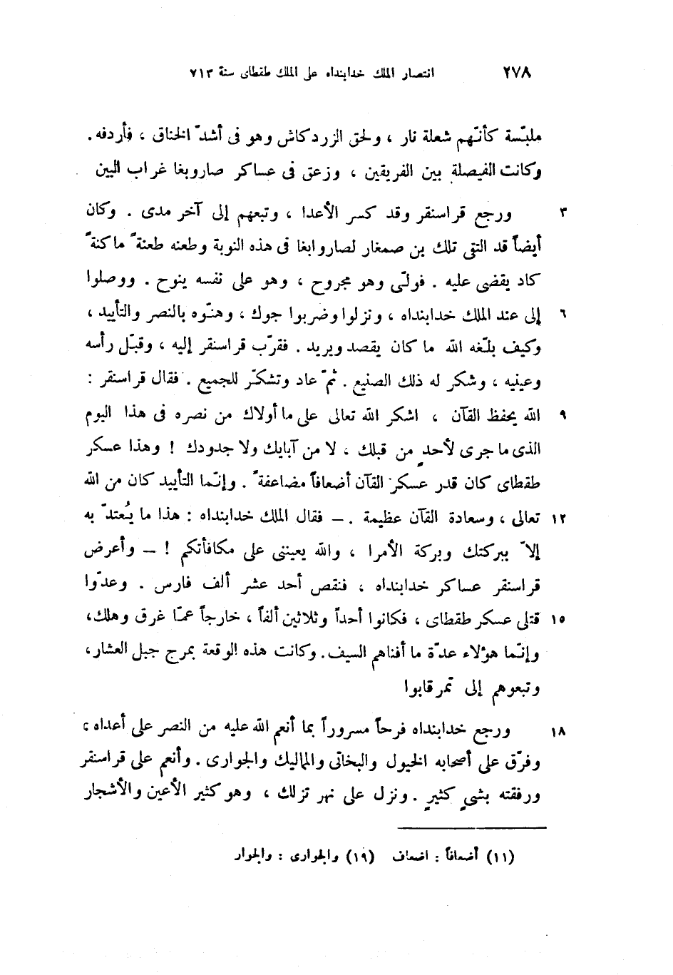 ورجع خدابنداه فرحا مسرورا بما أنعم الله عليه من النصر على أعداه، وفرّق على أصحابه الخيول والبخاتى والمماليك والجوارى (19). وأنعم على قراسنقر ورفقته بشى كثير. ونزل على نهر تزلك، وهو كثير الأعين والأشجار