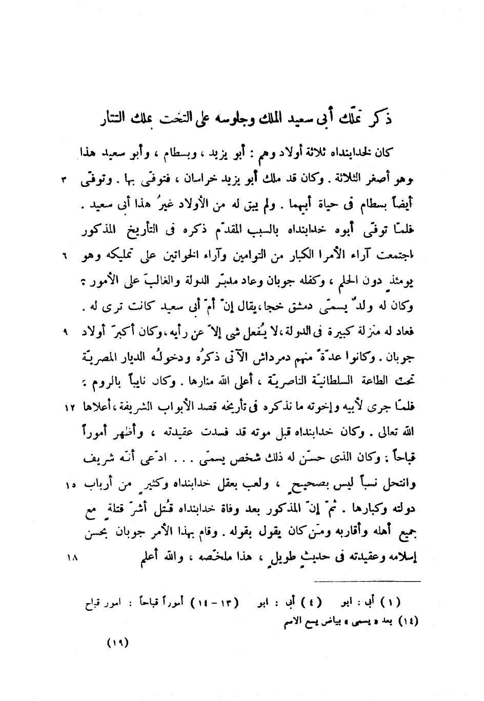 فعاد له منزلة كبيرة فى الدولة، لا يفعل شى إلاّ عن رأيه، وكان أكبر أولاد جوبان. وكانوا عدّة منهم دمرداش الآتى ذكره ودخوله الديار المصريّة تحت الطاعة السلطانيّة الناصريّة، أعلى الله منارها. وكان نايبا بالروم، فلمّا جرى لأبيه وإخوته ما نذكره فى تأريخه قصد الأبواب الشريفة، أعلاها الله تعالى. وكان خدابنداه قبل موته قد فسدت عقيدته، وأظهر أمورا قباحا (14)، وكان الذى حسّن له ذلك شخص يسمّى (14_). . . ادّعى أنّه شريف وانتحل نسبا ليس بصحيح، ولعب بعقل خدابنداه وكثير من أرباب دولته وكبارها. ثمّ إنّ المذكور بعد وفاة خدابنداه قتل أشرّ قتلة مع جميع أهله وأقاربه ومن كان يقول بقوله. وقام بهذا الأمر جوبان بحسن إسلامه وعقيدته فى حديث طويل، هذا ملخّصه، والله أعلم