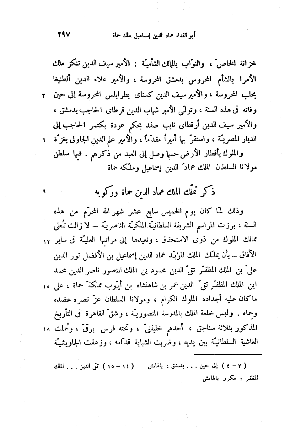 وذلك لمّا كان يوم الخميس سابع عشر شهر الله المحرّم من هذه السنة، برزت المراسم الشريفة السلطانيّة الملكيّة الناصريّة-لا زالت تعلى ممالك الملوك من ذوى الاستحقاق، وتعيدها إلى مراتبها العليّة فى ساير الآفاق-بأن يملّك الملك المؤيّد عماد الدين إسماعيل بن الأفضل نور الدين علىّ بن الملك المظفّر تقىّ الدين (14) محمود بن الملك المنصور ناصر الدين محمد ابن الملك المظفّر تقىّ الدين (15) عمر بن شاهنشاه بن أيّوب مملكة حماة، على ما كان عليه أجداده الملوك الكرام، ومولانا السلطان عزّ نصره عضده وحماه. ولبس خلعة الملك بالمدرسة المنصوريّة، وشقّ القاهرة فى التأريخ المذكور بثلاثة سناجق، أحدهم خليفتىّ، وتحته فرس برقىّ، وحملت الغاشية السلطانيّة بين يديه، وضربت الشبابة قدّامه، وزعقت الجاويشيّة