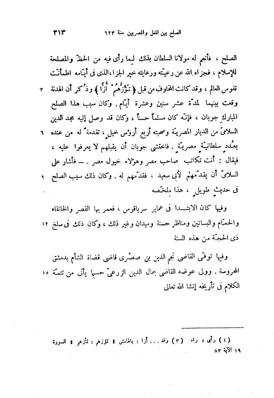 الصلح، فأنعم له مولانا السلطان بذلك لما رأى (1) فيه من الحظّ والمصلحة للإسلام، فجزاه الله عن رعيّته ورعايته خير الجزا، الذى فى أيّامه اطمأنّت نفوس العالم، وقد (3) كانت المخاوف من قبل {تَؤُزُّهُمْ أَزًّا} وذكر أن الهدنة وقعت بينهما لمدّة عشر سنين وعشرة أيّام. وكان سبب هذا الصلح المبارك جوبان، فإنّه كان مسلما حسنا، وكان قد وصل إليه مجد الدين السلامىّ من الديار المصريّة وصحبته أربع أرؤس خيل، تقدمة له من عنده بعدد سلطانيّة مصريّة. فاختشى جوبان أن يقبلهم لا يعرفوا عليه، فيقال: أنت تكاتب صاحب مصر وهؤلاء خيول مصر. -فأشار على السلامىّ أن يقدّمهم لأبى سعيد، فقدّمهم له. وكان ذلك سبب الصلح فى حديث طويل، هذا ملخّصه