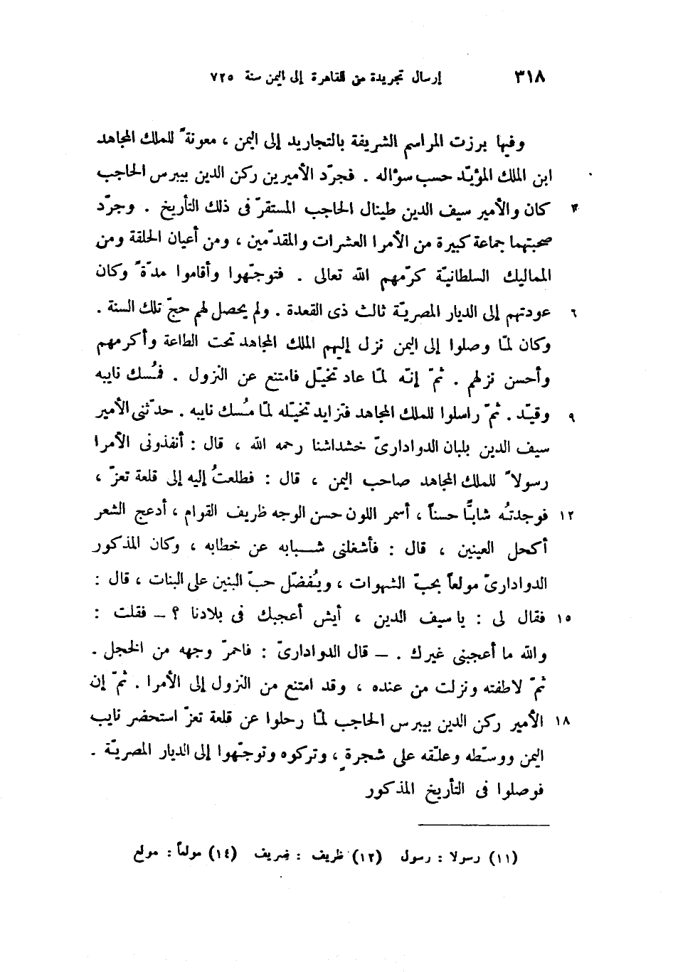 وكان لمّا وصلوا إلى اليمن نزل إليهم الملك المجاهد تحت الطاعة وأكرمهم وأحسن نزلهم. ثمّ إنّه لمّا عاد تخيّل فامتنع عن النزول. فمسك نايبه وقيّد. ثمّ راسلوا للملك المجاهد فتزايد تخيّله لمّا مسك نايبه. حدّثنى الأمير سيف الدين بلبان الدوادارىّ خشداشنا رحمه الله، قال: أنفذونى الأمرا رسولا (11) للملك المجاهد صاحب اليمن، قال: فطلعت إليه إلى قلعة تعزّ، فوجدته شابّا حسنا، أسمر اللون حسن الوجه ظريف (12) القوام، أدعج الشعر أكحل العينين، قال: فأشغلنى شبابه عن خطابه، وكان المذكور الدوادارىّ مولعا (14) بحبّ الشهوات، ويفضّل حبّ البنين على البنات، قال: