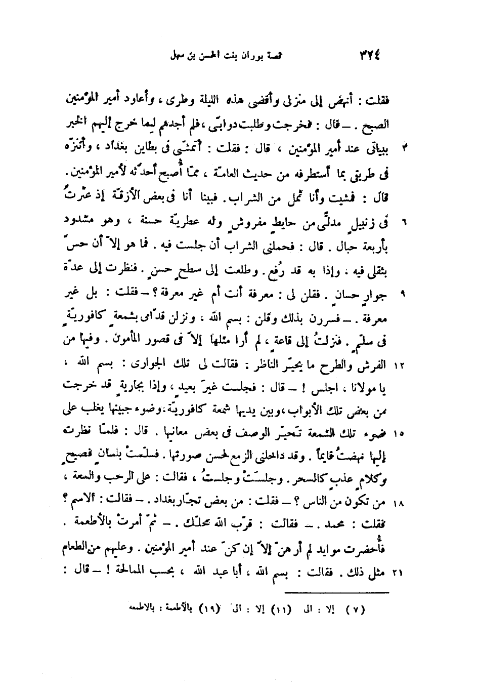 قال: فمشيت وأنا ثمل من الشراب. فبينا أنا فى بعض الأزقّة إذ عثرت فى زنبيل مدلّى من حايط مفروش وله عطريّة حسنة، وهو مشدود بأربعة حبال. قال: فحملنى الشراب أن جلست فيه. فما هو إلاّ (7) أن حسّ بثقلى فيه، وإذا به قد رفع. وطلعت إلى سطح حسن. فنظرت إلى عدّة جوار حسان. فقلن لى: معرفة أنت أم غير معرفة؟ -فقلت: بل غير معرفة. -فسررن بذلك وقلن: بسم الله، ونزلن قدّامى بشمعة كافوريّة فى سلّم. فنزلت إلى قاعة، لم أرا مثلها إلاّ (11) فى قصور المأمون. وفيها من الفرش والطرح ما يحيّر الناظر. فقالت لى تلك الجوارى: بسم الله، يا مولانا، اجلس! -قال: فجلست غير بعيد، وإذا بجارية قد خرجت من بعض تلك الأبواب، وبين يديها شمعة كافوريّة، وضوء جبينها يغلب على ضوء تلك الشمعة تحيّر الوصف فى بعض معانيها. قال: فلمّا نظرت إليها نهضت قايما. وقد داخلنى الزمع لحسن صورتها. فسلّمت بلسان فصيح وكلام عذب كالسحر. وجلست وجلست، فقالت: على الرحب والسعة، من تكون من الناس؟ -فقلت: من بعض تجّار بغداد. -فقالت: الاسم؟ فقلت: محمد. -فقالت: قرّب الله محلّك. -ثمّ أمرت بالأطعمة (19).