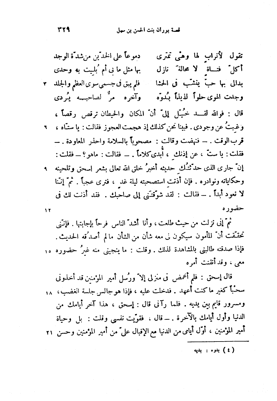 إنّ جارى الذى حدّثتك حديثه أخبر خلق الله تعالى بشعر اسحق وتلحينه وحكاياته ونوادره. فإن أذنت استصحبته ليلة غد، فترى عجبا. ثمّ إنّنا لا نعود أبدا. -فقالت: لقد شوّقتنى إلى صاحبك. فقد أذنت لك فى حضوره