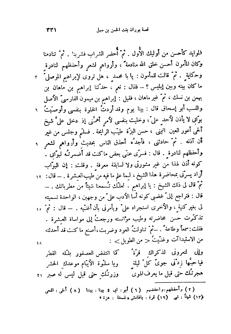 ثمّ قال لى ذلك الشيخ: يا إبراهيم، لعلّك تسمعنا شيئا (13) من مطرباتك. - قال: فتراجع إلىّ غضبى كونه أسا الأدب علىّ من وجهين، الواحدة تسميته لى بغير كنية، والأخرى استجراه علىّ ويأمرنى بأن أغنّيه. -قال: ثمّ تذكّرت حسن محاضرته وطيب مؤانسته ورجعت إلى مواساة العشرة.