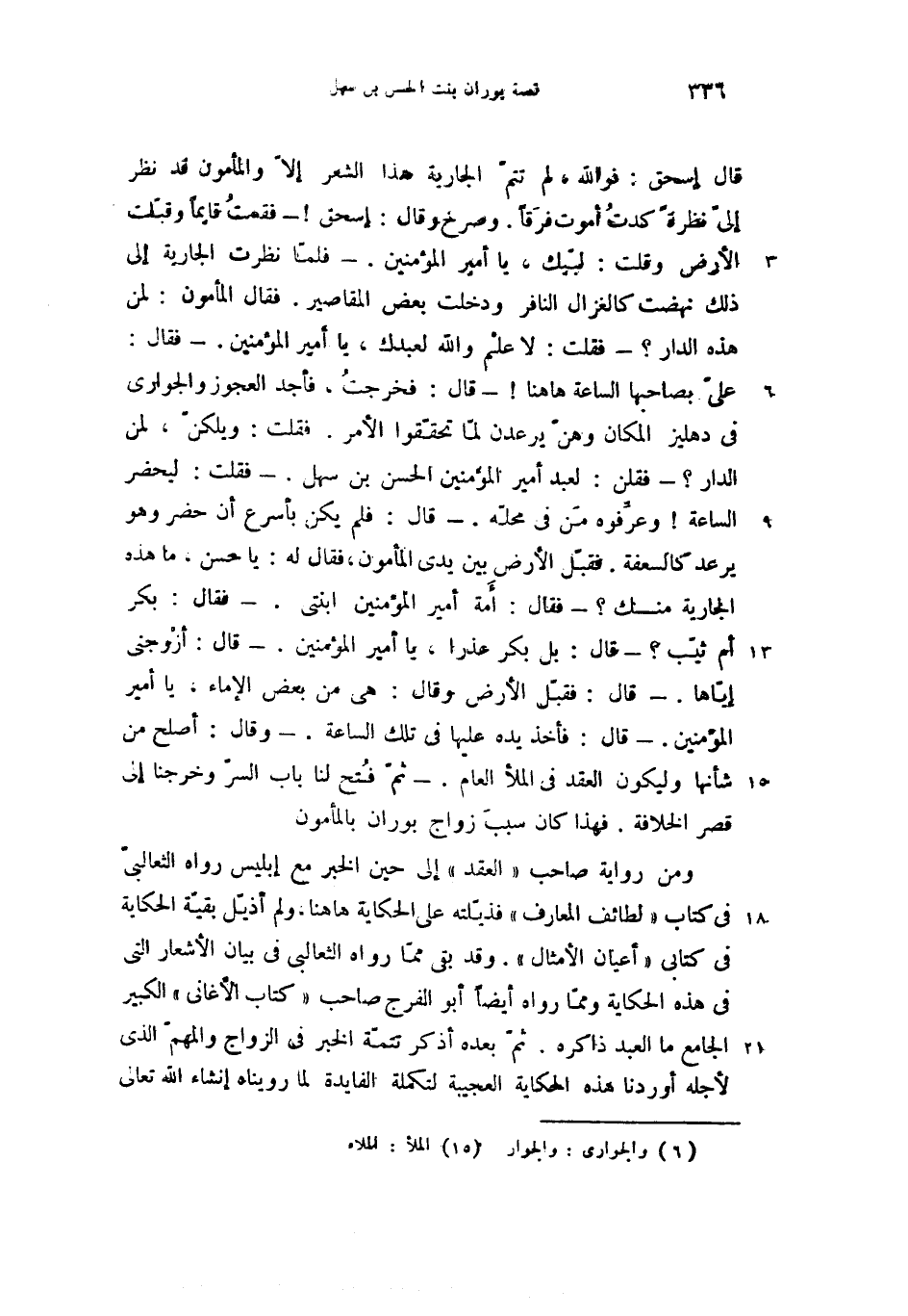 علىّ بصاحبها الساعة هاهنا! -قال: فخرجت، فأجد العجوز والجوارى (6) فى دهليز المكان وهنّ يرعدن لمّا تحقّقوا الأمر. فقلت: ويلكنّ، لمن الدار؟ -فقلن: لعبد أمير المؤمنين الحسن بن سهل. -فقلت: ليحضر الساعة! وعرّفوه من محلّه. -قال: فلم يكن بأسرع أن حضر وهو يرعد كالسعفة. فقبّل الأرض بين يدى المأمون، فقال له: يا حسن، ما هذه الجارية منك؟ -فقال: أمة أمير المؤمنين ابنتى. -فقال: بكر أم ثيّب؟ -قال: بل بكر عذرا، يا أمير المؤمنين. -قال: أزوجنى إيّاها. -قال: فقبّل الأرض وقال: هى من بعض الإماء، يا أمير المؤمنين. -قال: فأخذ يده عليها فى تلك الساعة. -وقال: أصلح من شأنها وليكون العقد فى الملأ (15) العام. -ثمّ فتح لنا باب السرّ وخرجنا إلى قصر الخلافة. فهذا كان سبب زواج بوران بالمأمون