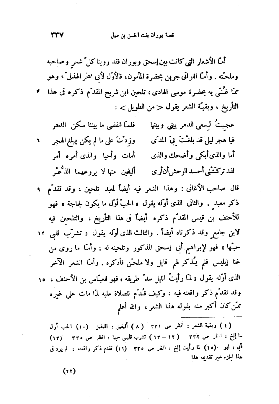 أمّا الأشعار التى كانت بين إسحق وبوران فقد روينا كلّ شر وصاحبه وملحّنه. وأمّا اللواتى جرين بحضرة المأمون، فالأوّل لأبى صخر الهذلىّ، وهو ممّا غنّى به بحضرة موسى الهادى، تلحين ابن شريح المقدّم ذكره فى هذا التأريخ، وبقيّة الشعر (4) يقول <من الطويل>: