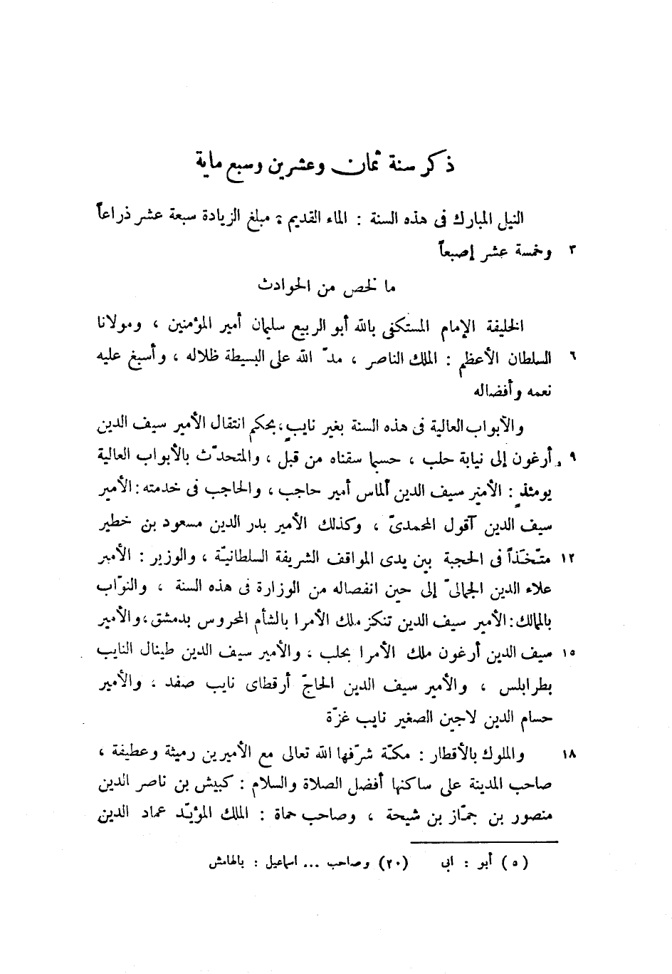 والملوك بالأقطار: مكّة شرّفها الله تعالى مع الأميرين رميثة وعطيفة، صاحب المدينة على ساكنها أفضل الصلاة والسلام: كبيش بن ناصر الدين منصور بن جمّاز بن شيحة، وصاحب (20) حماة: الملك المؤيّد عماد الدين
