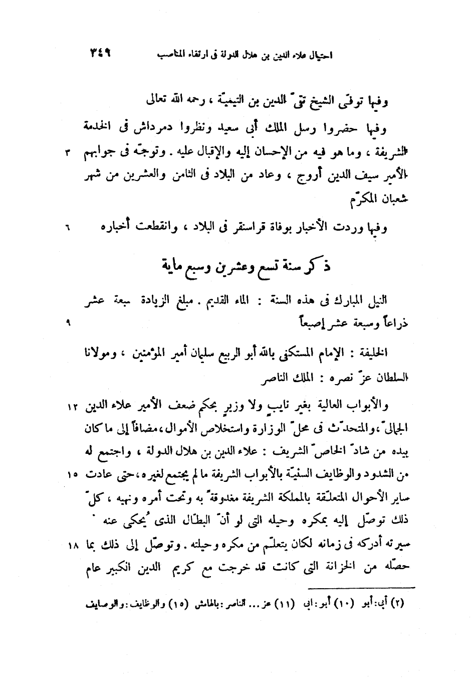 والأبواب العالية بغير نايب ولا وزير بحكم ضعف الأمير علاء الدين الجمالىّ، والمتحدّث فى محلّ الوزارة واستخلاص الأموال، مضافا إلى ما كان بيده من شادّ الخاصّ الشريف: علاء الدين بن هلال الدولة، واجتمع له من الشدود والوظايف (15) السنيّة بالأبواب الشريفة ما لم يجتمع لغيره، حتى عادت ساير الأحوال المتعلّقة بالمملكة الشريفة مغدوقة به وتحت أمره ونهيه، كلّ ذلك توصّل إليه بمكره وحيله التى لو أنّ البطّال الذى يحكى عنه سيرته أدركه فى زمانه لكان يتعلّم من مكره وحيلته. وتوصّل إلى ذلك بما حصّله من الخزانة التى كانت قد خرجت مع كريم الدين الكبير عام