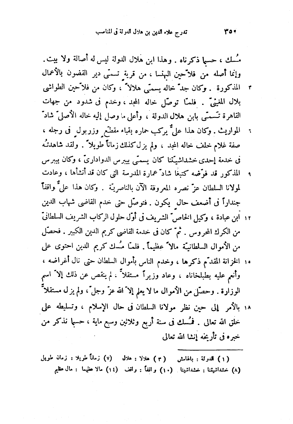وإنما أصله من فلاّحين البهنسا، من قرية تسمّى دير القضون بالأعمال المذكورة. وكان جدّ خاله يسمّى هلالا (3)، وكان من فلاّحين الطواشى بلال المغيثىّ. فلمّا توصّل خاله المجد، وخدم فى شدود من جهات القاهرة تسمّى بابن هلال الدولة، وأعلى ما وصل إليه خاله الأصلىّ شادّ المواريث. وكان هذا علىّ يركب حماره بقباء مقطّع وزربول فى رجله، صفة غلام خلف خاله المجد، ولم يزل كذلك زمانا طويلا (7). ولقد شاهدته فى خدمة إحدى خشداشيّتنا (8) كان يسمّى بيبرس الدوادارىّ، وكان بيبرس المذكور قد فوّضه كتبغا شادّ عمارة المدرسة التى كان قد أنشأها، وعادت لمولانا السلطان عزّ نصره المعروفة الآن بالناصريّة. وكان هذا علىّ واقفا (10) جندارا فى أضعف حال يكون. فتوصّل حتى خدم القاضى شهاب الدين ابن عبادة، وكيل الخاصّ الشريف فى أوّل حلول الركاب الشريف السلطانىّ من الكرك المحروس. ثمّ كان فى خدمة القاضى كريم الدين الكبير. فحصّل من الأموال السلطانيّة مالا عظيما (14). فلمّا مسك كريم الدين احتوى على الخزانة المقدّم ذكرها، وخدم الناس بأموال السلطان حتى نال أغراضه، وأنعم عليه بطبلخاناه، وعاد وزيرا مستقلاّ، لم ينقص عن ذلك إلاّ اسم الوزارة. وحصّل من الأموال ما لا يعلم إلاّ الله عزّ وجلّ، ولم يزل مستقلاّ بالأمر إلى حين نظر مولانا السلطان فى حال الإسلام، وتسليطه على خلق الله تعالى. فمسك فى سنة أربع وثلاثين وسبع ماية، حسبما نذكر من خبره فى تأريخه إنشا الله تعالى
