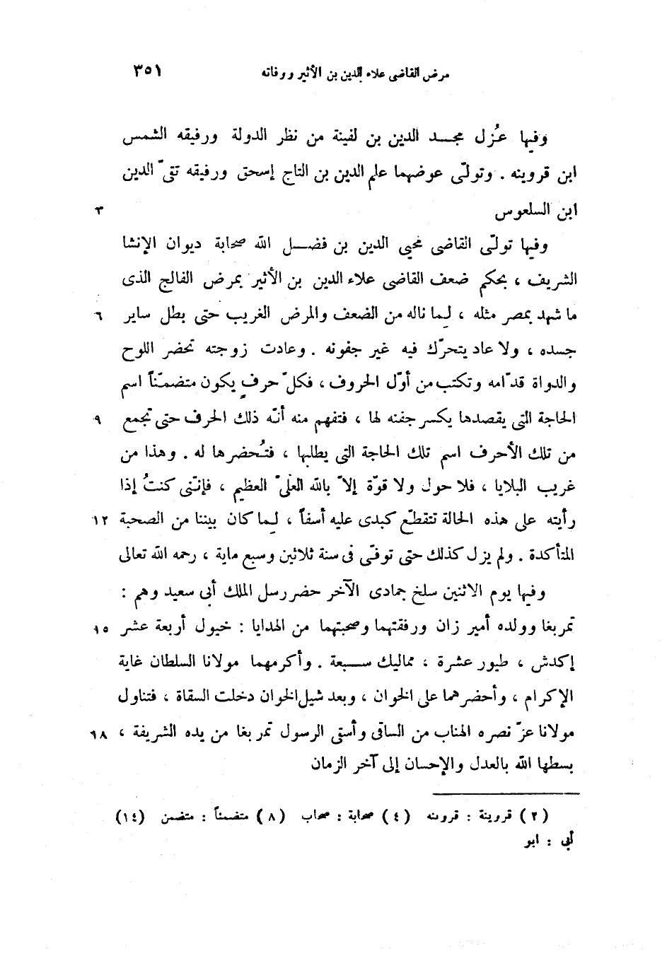 وفيها تولّى القاضى محيى الدين بن فضل الله صحابة (4) ديوان الإنشا الشريف، بحكم ضعف القاضى علاء الدين بن الأثير بمرض الفالج الذى ما شهد بمصر مثله، لما ناله من الضعف والمرض الغريب حتى بطل ساير جسده، ولا عاد يتحرّك فيه غير جفونه. وعادت زوجته تحضر اللوح والدواة قدّامه وتكتب من أوّل الحروف، فكلّ حرف يكون متضمّنا (8) اسم الحاجة التى يقصدها يكسر جفنه لها، فتفهم منه أنّه ذلك الحرف حتى تجمع من تلك الأحرف اسم تلك الحاجة التى يطلبها، فتحضرها له. وهذا من غريب البلايا، فلا حول ولا قوّة إلاّ بالله العلىّ العظيم، فإنّنى كنت إذا رأيته على هذه الحالة تتقطّع كبدى عليه أسفا، لما كان بيننا من الصحبة المتأكدة. ولم يزل كذلك حتى توفّى فى سنة ثلاثين وسبع ماية، رحمه الله تعالى
