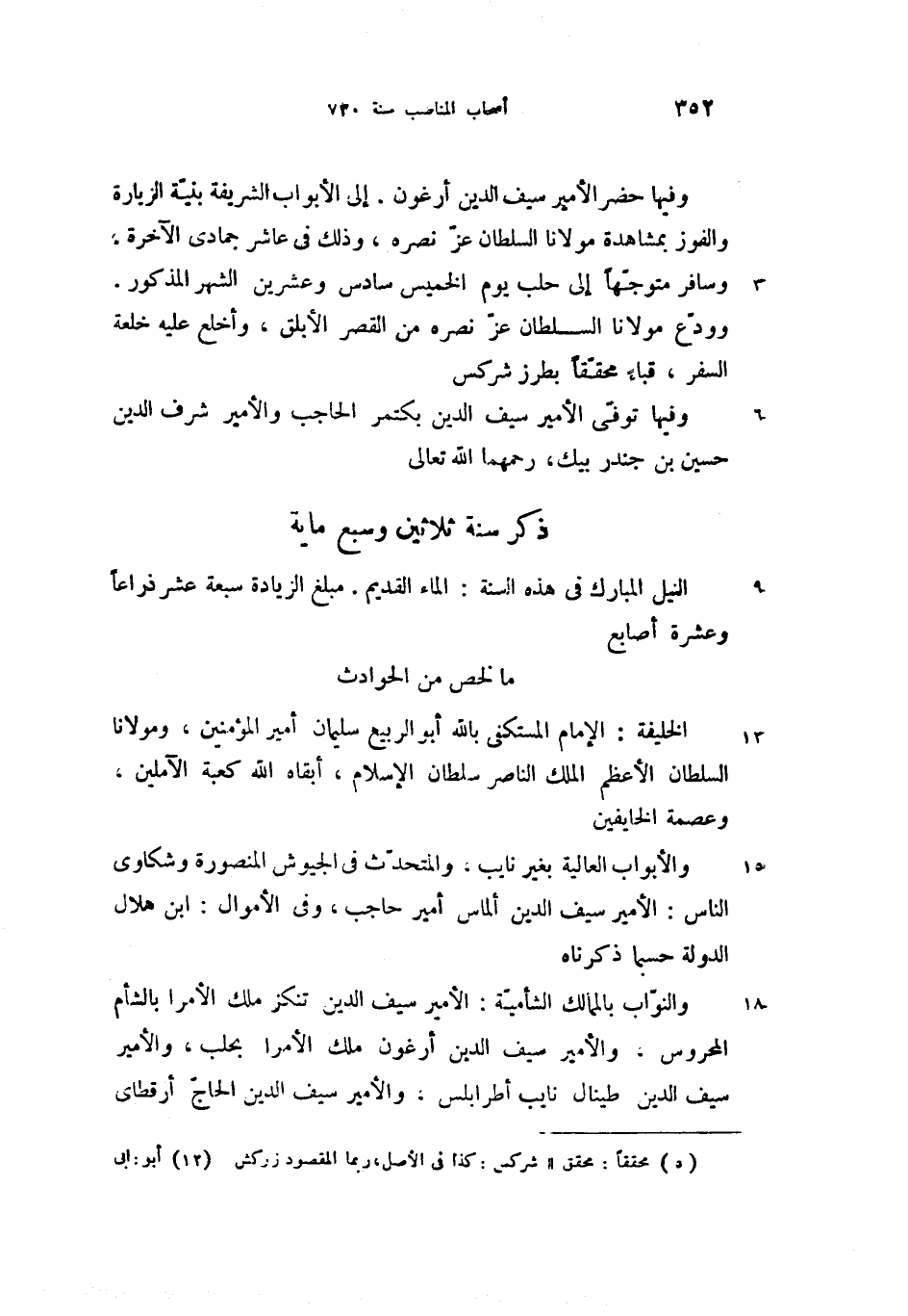 وفيها حضر الأمير سيف الدين أرغون. إلى الأبواب الشريفة بنيّة الزيارة والفوز بمشاهدة مولانا السلطان عزّ نصره، وذلك فى عاشر جمادى الآخرة، وسافر متوجّها إلى حلب يوم الخميس سادس وعشرين الشهر المذكور.