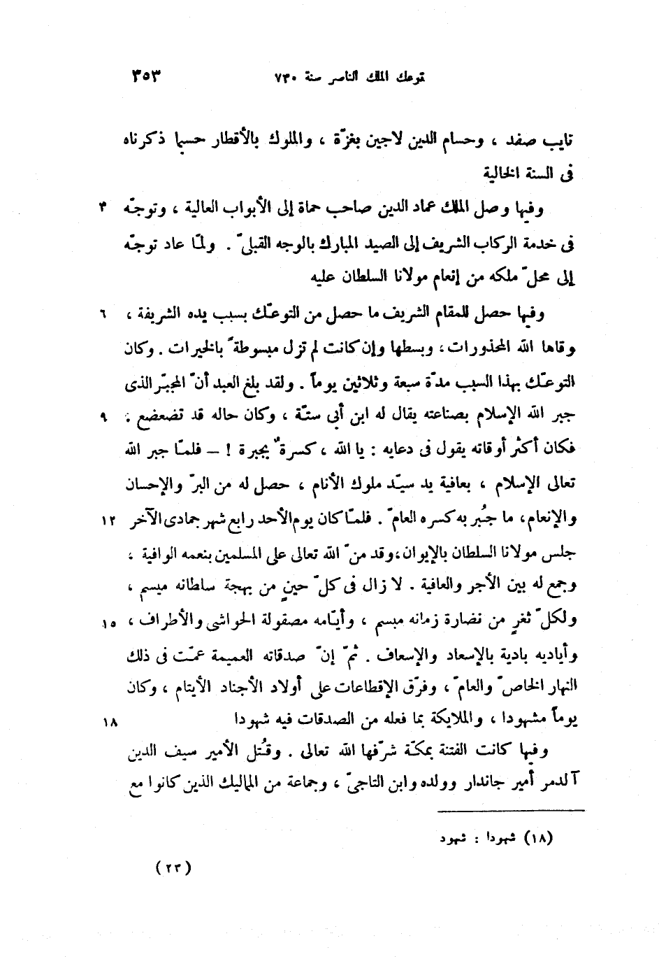فكان أكثر أوقاته يقول فى دعايه: يا الله، كسرة بجبرة! -فلمّا جبر الله تعالى الإسلام، بعافية يد سيّد ملوك الأنام، حصل له من البرّ والإحسان والإنعام، ما جبر به كسره العامّ. فلمّا كان يوم الأحد رابع شهر جمادى الآخر جلس مولانا السلطان بالإيوان، وقد منّ الله تعالى على المسلمين بنعمه الوافية، وجمع له بين الأجر والعافية. لا زال فى كلّ حين من بهجة سلطانه ميسم، ولكلّ ثغر من نضارة زمانه مبسم، وأيّامه مصقولة الحواشى والأطراف، وأياديه بادية بالإسعاد والإسعاف. ثمّ إنّ صدقاته العميمة عمّت فى ذلك النهار الخاصّ والعامّ، وفرّق الإقطاعات على أولاد الأجناد الأيتام، وكان يوما مشهودا، والملايكة بما فعله من الصدقات فيه شهودا (18)
