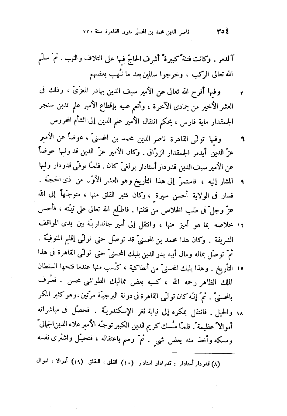 وفيها تولّى القاهرة ناصر الدين محمد بن المحسنىّ، عوضا عن الأمير عزّ الدين أيدمر الجمقدار الزرّاق. وكان الأمير عزّ الدين قد وليها عوضا عن الأمير سيف الدين قدودار أستادار (8) برلغىّ كان. فلمّا توفّى قدودار وليها المشار إليه، فاستمرّ إلى هذا التأريخ وهو العشر الأوّل من ذى الحجّة.