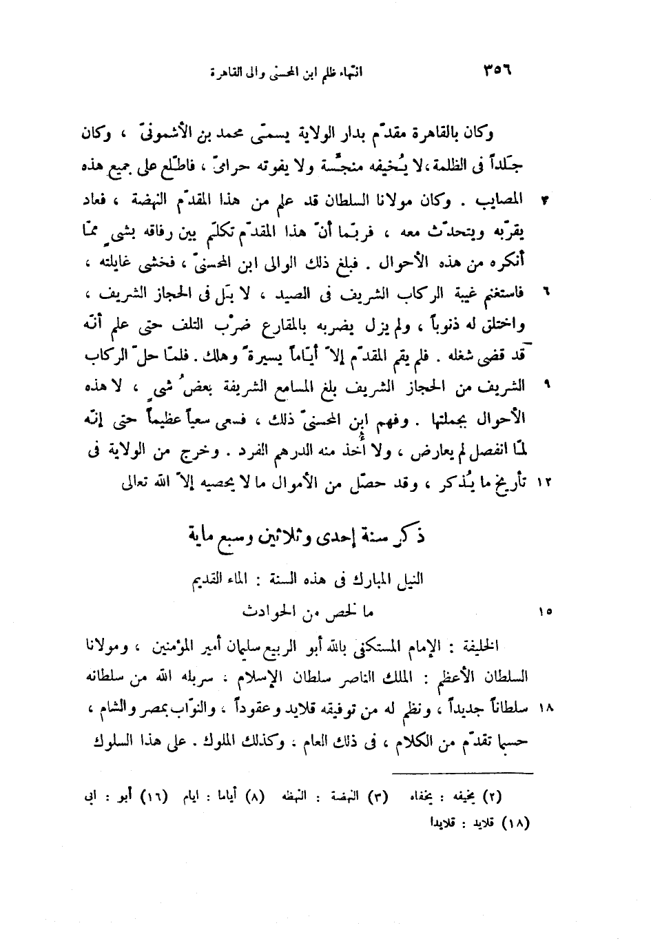 وكان بالقاهرة مقدّم بدار الولاية يسمّى محمد بن الأشمونىّ، وكان جلدا فى الظلمة، لا يخيفه (2) منجسّة ولا يفوته حرامىّ، فاطّلع على جميع هذه المصايب. وكان مولانا السلطان قد علم من هذا المقدّم النهضة (3)، فعاد يقرّبه ويتحدّث معه، فربّما أنّ هذا المقدّم تكلّم بين رفاقه بشى ممّا أنكره من هذه الأحوال. فبلغ ذلك الوالى ابن المحسنىّ، فخشى غايلته، فاستغنم غيبة الركاب الشريف فى الصيد، لا بل فى الحجاز الشريف، واختلق له ذنوبا، ولم يزل يضربه بالمقارع ضرب التلف حتى علم أنّه قد قضى شغله. فلم يقم المقدّم إلاّ أيّاما (8) يسيرة وهلك. فلمّا حلّ الركاب الشريف من الحجاز الشريف بلغ المسامع الشريفة بعض شى، لا هذه الأحوال بجملتها. وفهم ابن المحسنىّ ذلك، فسعى سعيا عظيما حتى إنّه لمّا انفصل لم يعارض، ولا أخذ منه الدرهم الفرد. وخرج من الولاية فى تأريخ ما يذكر، وقد حصّل من الأموال ما لا يحصيه إلاّ الله تعالى