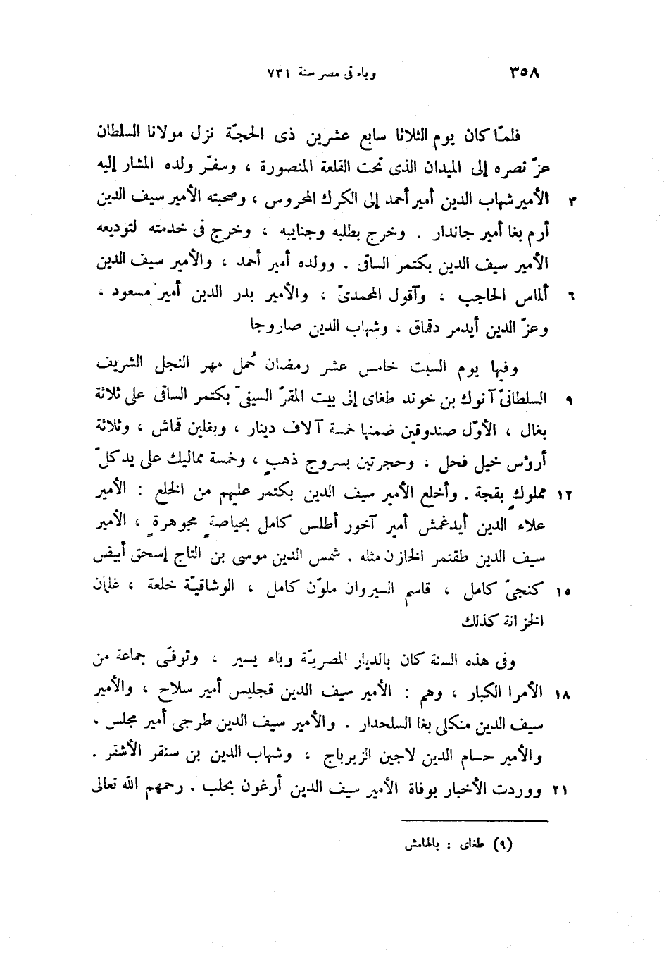 وفى هذه السنة كان بالديار المصريّة وباء يسير، وتوفّى جماعة من الأمرا الكبار، وهم: الأمير سيف الدين قجليس أمير سلاح، والأمير سيف الدين منكلى بغا السلحدار. والأمير سيف الدين طرجى أمير مجلس، والأمير حسام الدين لاجين الزيرباج، وشهاب الدين بن سنقر الأشقر.