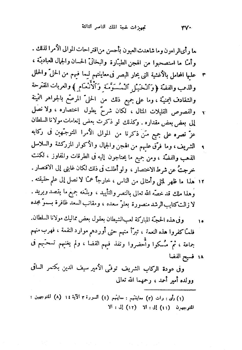 وأمّا ما استصحبوا من الهجن الطيّارة والبخاتىّ الحسان والجمال العباديّة، عليها المحامل بالأغشية التى يحار البصر فى معاينتهم (3) لما فيهم من الحلىّ والحلل والذهب والفضّة {وَالْخَيْلِ الْمُسَوَّمَةِ وَالْأَنْعامِ} (4) والعربات المقترحة والشقادف اليمنيّة، وما على جميع ذلك من الحلىّ المرصّع بالجواهر الثمينة والفصوص القليلات المثال، لكان شرح يطول اختصاره، ولا نصل إلى بعض بعض مقداره. وكذلك لو ذكرت بعض إنعامات مولانا السلطان عزّ نصره على جميع ما ذكرنا من الموالى الأمرا المتوجّهين (8) فى ركابه الشريف، وما فرّق عليهم من الهجن والجمال والأكوار المزركشة والسلاسل الذهب والفضّة، ومن جميع ما يحتاجون إليه فى الطرقات والمفاوز، لكنت خرجت عن شرط الاختصار، ولو أطلت فى ذلك لكان غايتى إلى (11) الاقتصار.