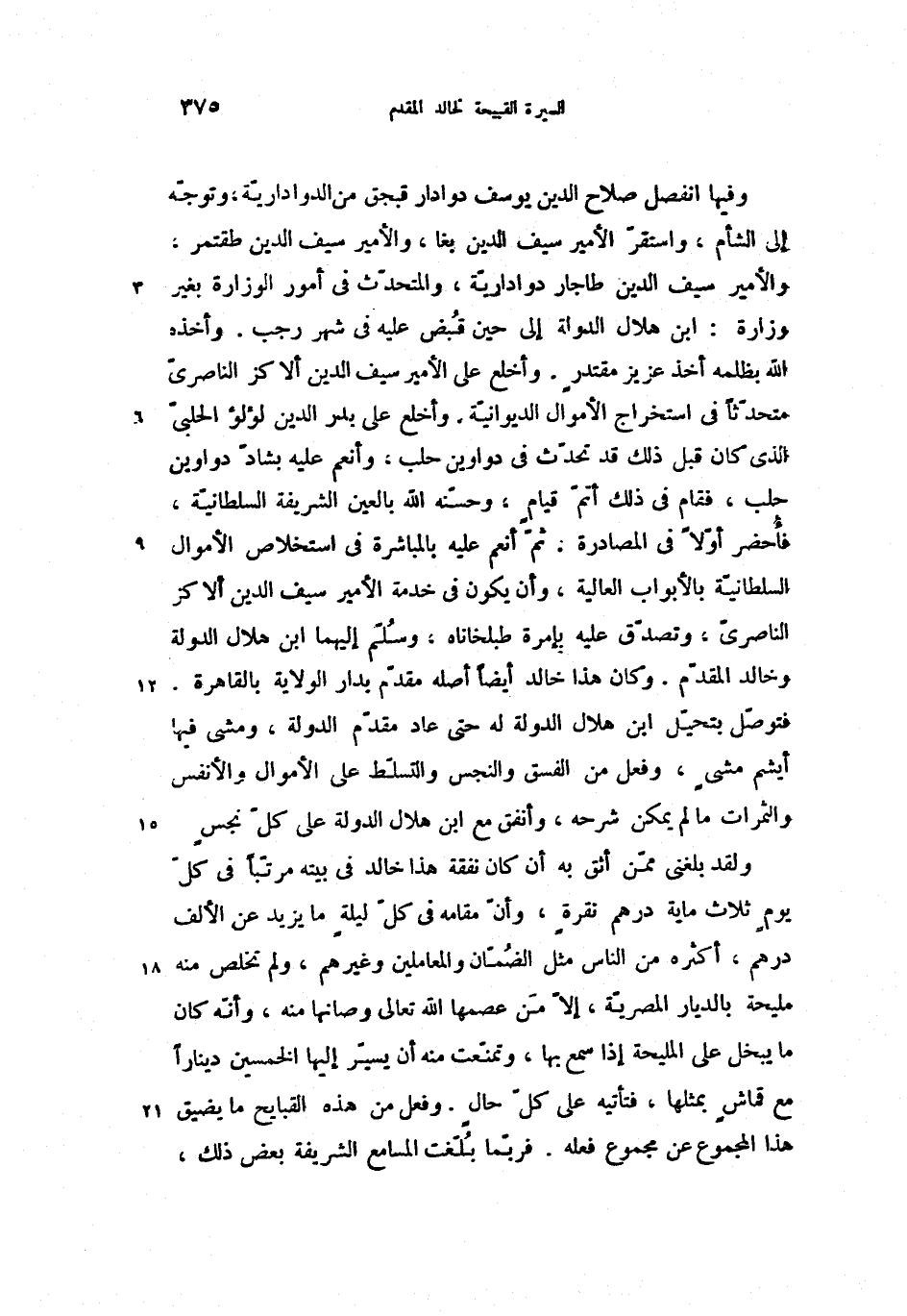 ولقد بلغنى ممّن أثق به أن كان نفقة هذا خالد فى بيته مرتّبا فى كلّ يوم ثلاث ماية درهم نقرة، وأنّ مقامه فى كلّ ليلة ما يزيد عن الألف درهم، أكثره من الناس مثل الضمّان والمعاملين وغيرهم، ولم تخلص منه مليحة بالديار المصريّة، إلاّ من عصمها الله تعالى وصانها منه، وأنّه كان ما يبخل على المليحة إذا سمع بها، وتمنّعت منه أن يسيّر إليها الخمسين دينارا مع قماش بمثلها، فتأتيه على كلّ حال. وفعل من هذه القبايح ما يضيق هذا المجموع عن مجموع فعله. فربّما بلّغت المسامع الشريفة بعض ذلك،