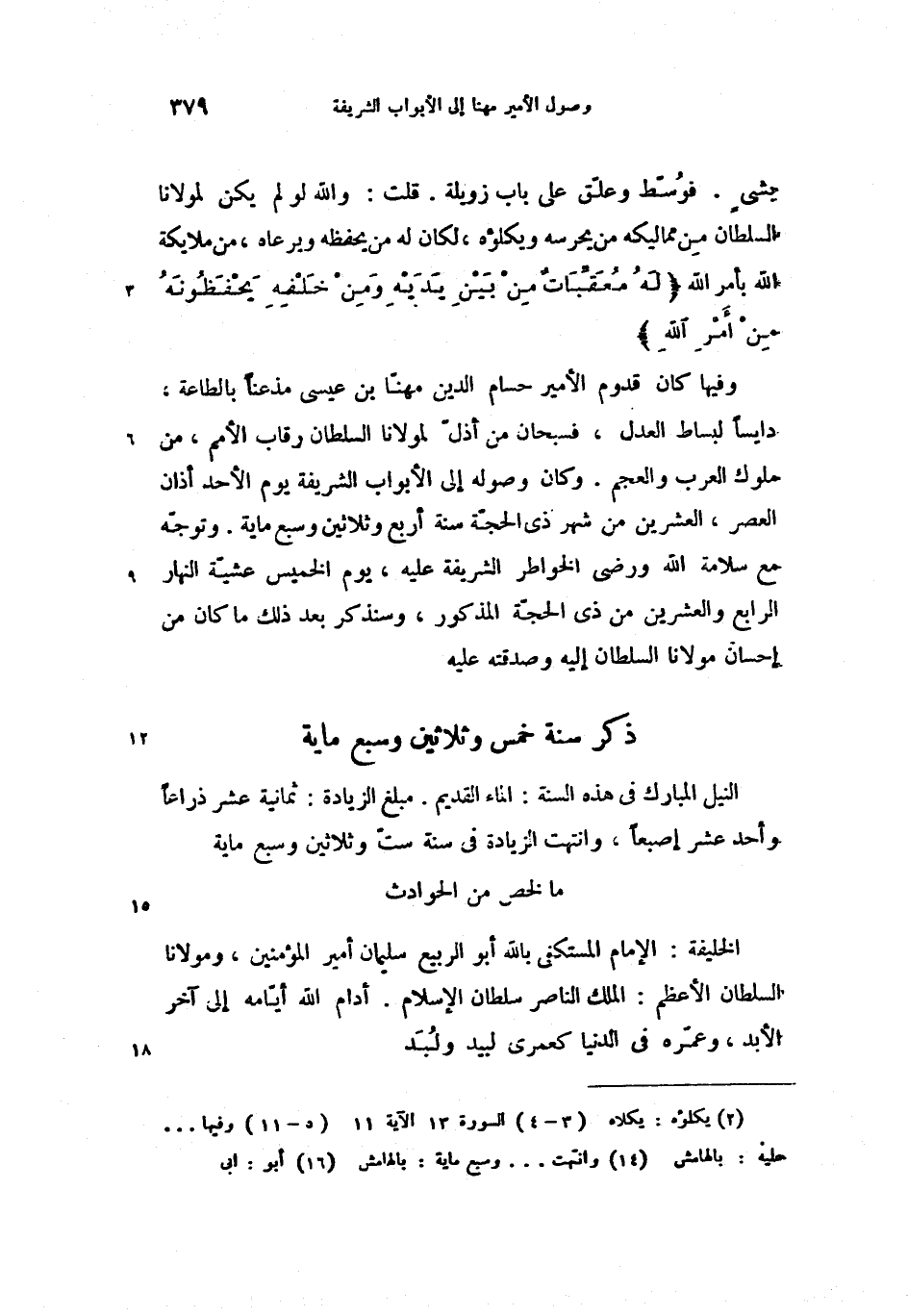 وفيها (5) كان قدوم الأمير حسام الدين مهنّا بن عيسى مذعنا بالطاعة، دايسا لبساط العدل، فسبحان من أذلّ لمولانا السلطان رقاب الأمم، من ملوك العرب والعجم. وكان وصوله إلى الأبواب الشريفة يوم الأحد أذان العصر، العشرين من شهر ذى الحجّة سنة أربع وثلاثين وسبع ماية. وتوجّه مع سلامة الله ورضى الخواطر الشريفة عليه، يوم الخميس عشيّة النهار الرابع والعشرين من ذى الحجّة المذكور، وسنذكر بعد ذلك ما كان من إحسان مولانا السلطان إليه وصدقته عليه (11)