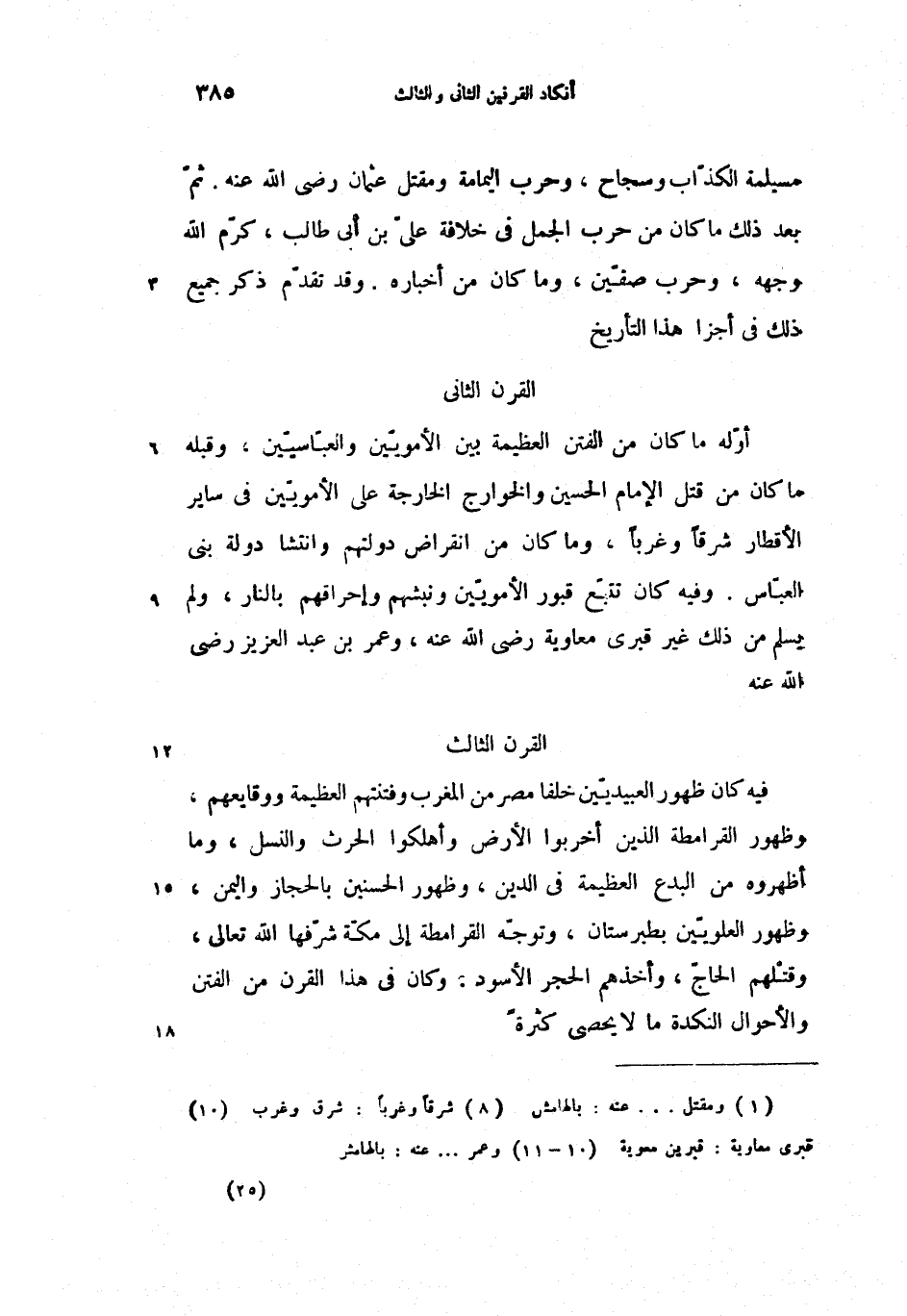 أوّله ما كان من الفتن العظيمة بين الأمويّين والعبّاسيّين، وقبله ما كان من قتل الإمام الحسين والخوارج الخارجة على الأمويّين فى ساير الأقطار شرقا وغربا (8)، وما كان من انقراض دولتهم وانتشا دولة بنى العبّاس. وفيه كان تتبّع قبور الأمويّين ونبشهم وإحراقهم بالنار، ولم يسلم من ذلك غير قبرى معاوية (10_) رضى الله عنه، وعمر (10) بن عبد العزيز رضى الله عنه (11)