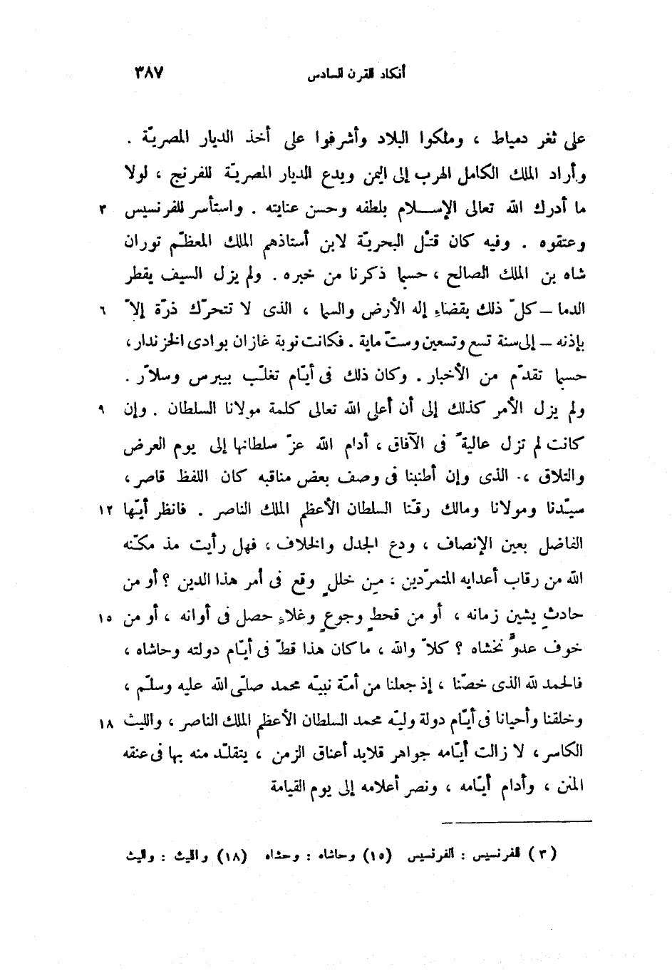 ولم يزل الأمر كذلك إلى أن أعلى الله تعالى كلمة مولانا السلطان. وإن كانت لم تزل عالية فى الآفاق، أدام الله عزّ سلطانها إلى يوم العرض والتلاق، الذى وإن أطنبنا فى وصف بعض مناقبه كان اللفظ قاصر، سيّدنا ومولانا ومالك رقّنا السلطان الأعظم الملك الناصر. فانظر أيّها الفاضل بعين الإنصاف، ودع الجدل والخلاف، فهل رأيت مذ مكّنه الله من رقاب أعدايه المتمرّدين، من خلل وقع فى أمر هذا الدين؟ أو من حادث يشين زمانه، أو من قحط وجوع وغلاء حصل فى أوانه، أو من خوف عدوّ نخشاه؟ كلاّ والله، ما كان هذا قطّ فى أيّام دولته وحاشاه (15)، فالحمد لله الذى خصّنا، إذ جعلنا من أمّة نبيّه محمد صلّى الله عليه وسلّم، وخلقنا وأحيانا فى أيّام دولة وليّه محمد السلطان الأعظم الملك الناصر، والليث (18) الكاسر، لا زالت أيّامه جواهر قلايد أعناق الزمن، يتقلّد منه بها فى عنقه المنن، وأدام أيّامه، ونصر أعلامه إلى يوم القيامة