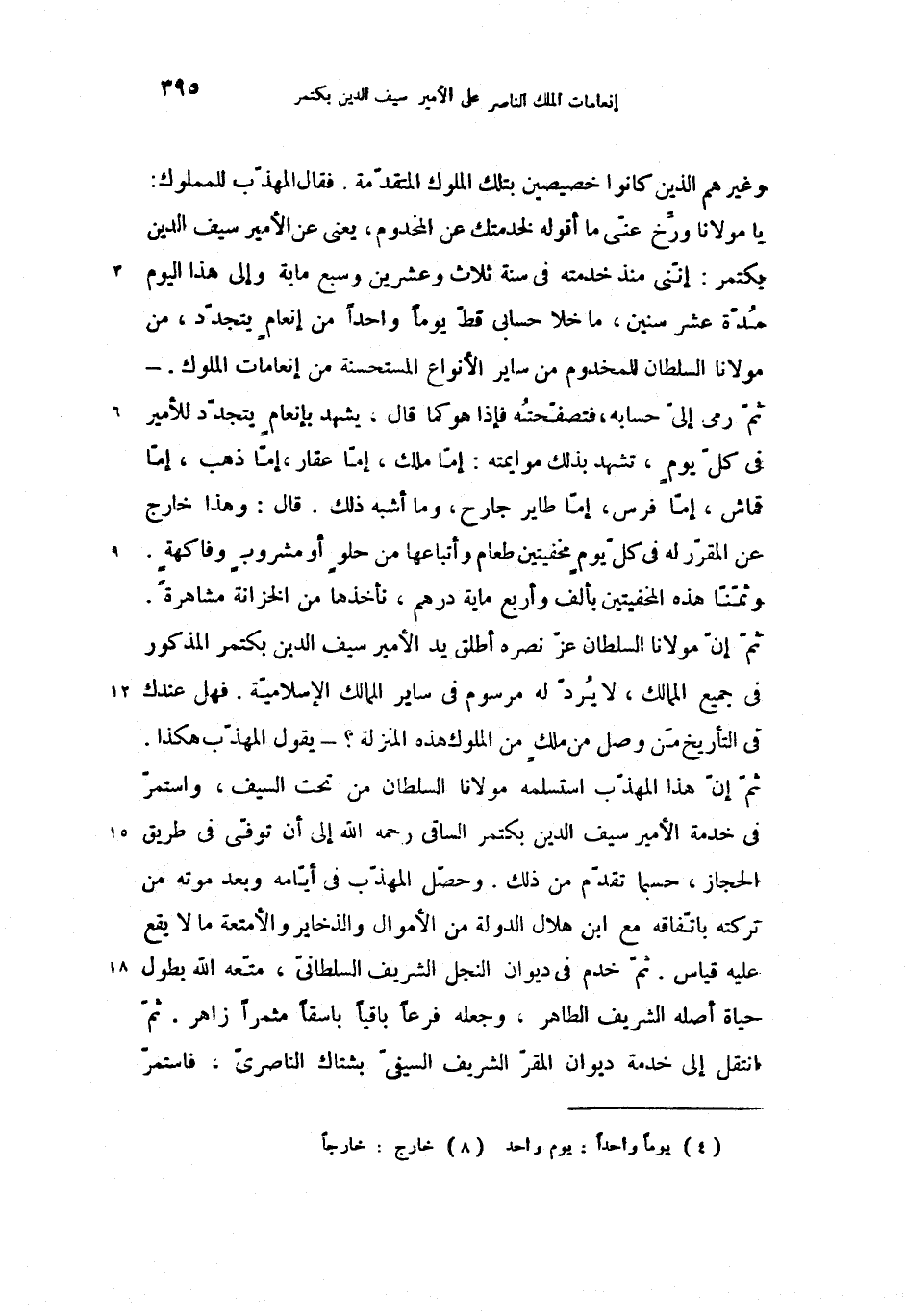 يا مولانا ورّخ عنّى ما أقوله لخدمتك عن المخدوم، يعنى عن الأمير سيف الدين بكتمر: إنّنى منذ خدمته فى سنة ثلاث وعشرين وسبع ماية وإلى هذا اليوم مدّة عشر سنين، ما خلا حسابى قطّ يوما واحدا (4) من إنعام يتجدّد، من مولانا السلطان للمخدوم من ساير الأنواع المستحسنة من إنعامات الملوك. - ثمّ رمى إلىّ حسابه، فتصفّحته فإذا هو كما قال، يشهد بإنعام يتجدّد للأمير فى كلّ يوم، تشهد بذلك موايمته: إمّا ملك، إمّا عقار، إمّا ذهب، إمّا قماش، إمّا فرس، إمّا طاير جارح (8)، وما أشبه ذلك. قال: وهذا خارج عن المقرّر له فى كلّ يوم مخفيتين طعام وأتباعها من حلو أو مشروب وفاكهة.