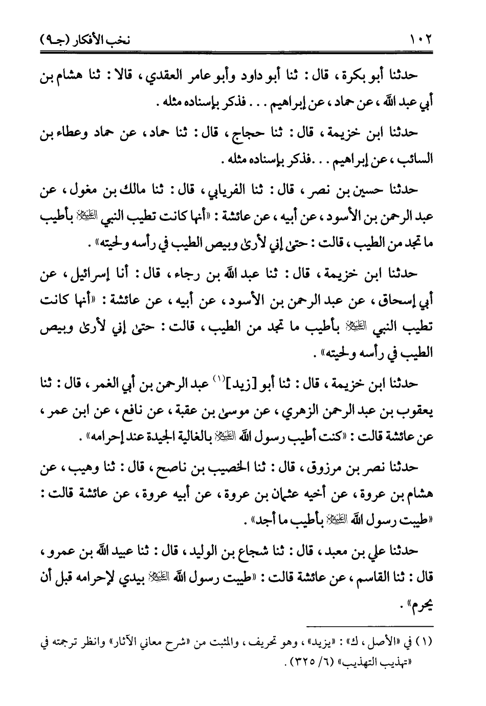 حدثنا ابن خزيمة، قال: ثنا أبو [زيد] (¬1) عبد الرحمن بن أبي الغمر، قال: ثنا يعقوب بن عبد الرحمن الزهري، عن موسى بن عقبة، عن نافع، عن ابن عمر، عن عائشة قالت: "كنت أطيب رسول الله -عليه السلام- بالغالية الجيدة عند إحرامه".