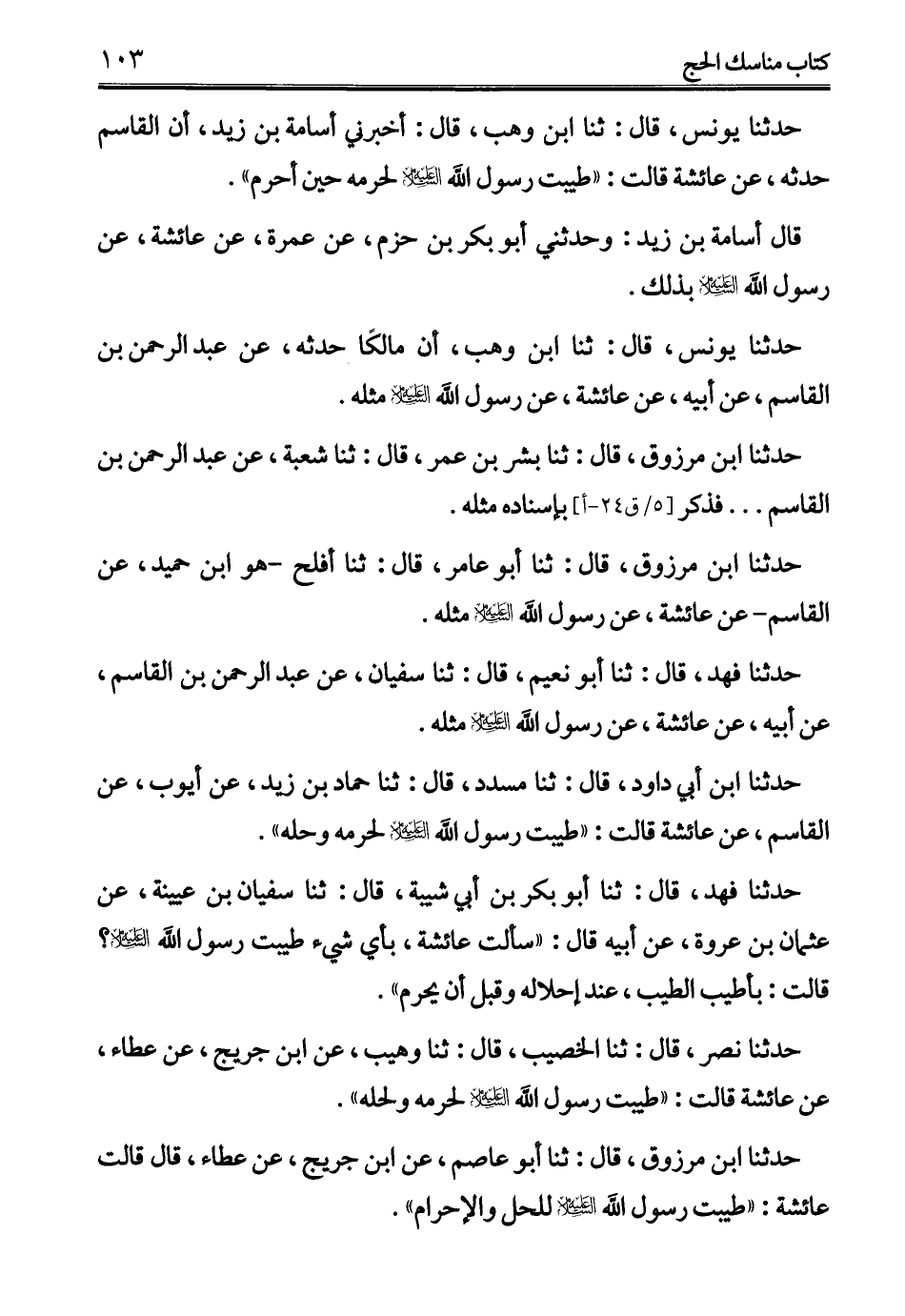حدثنا ابن أبي داود، قال: ثنا مسدد، قال: ثنا حماد بن زيد، عن أيوب، عن القاسم، عن عائشة قالت: "طيبت رسول الله -عليه السلام- لحرمه وحله".