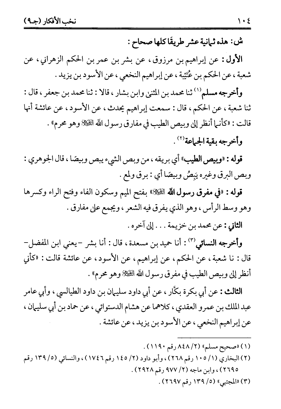 وأخرجه النسائي (¬3): أنا حميد بن مسعدة، قال: أنا بشر -يعني ابن المفضل- قال: نا شعبة، عن الحكم، عن إبراهيم، عن الأسود، عن عائشة قالت: "كأني انظر إلى وبيص الطيب في مفرق رسول الله -عليه السلام- وهو محرم".