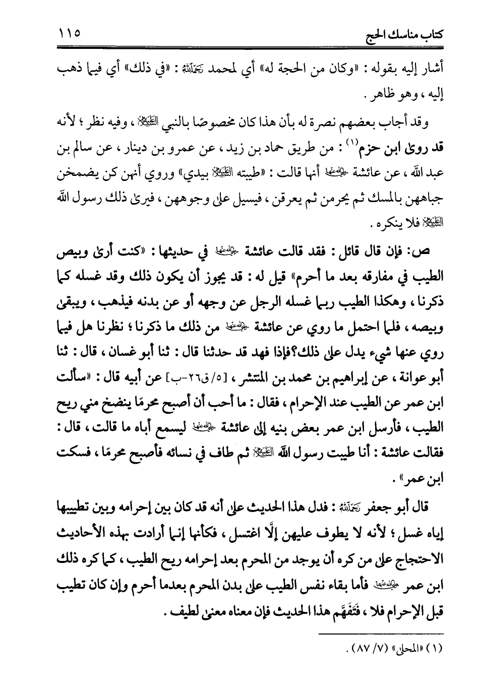 وقد أجاب بعضهم نصرة له بأن هذا كان مخصوصًا بالنبي -عليه السلام-، وفيه نظر؛ لأنه قد روى ابن حزم (¬1): من طريق حماد بن زيد، عن عمرو بن دينار، عن سالم بن عبد الله، عن عائشة -رضي الله عنها- أنها قالت: "طيبته -عليه السلام- بيدي" وروي أنهن كن يضمخن جباههن بالمسك ثم يحرمن ثم يعرقن، فيسيل على وجوههن، فيرى ذلك رسول الله -عليه السلام- فلا ينكره.