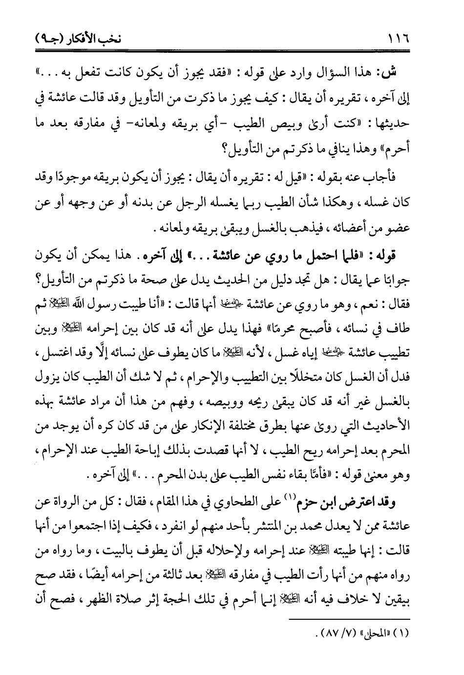 قوله: "فلما احتمل ما روي عن عائشة ... " إلى آخره. هذا يمكن أن يكون جوابًا عما يقال: هل تجد دليل من الحديث يدل على صحة ما ذكرتم من التأويل؟ فقال: نعم، وهو ما روي عن عائشة -رضي الله عنها- أنها قالت: "أنا طيبت رسول الله -عليه السلام- ثم طاف في نسائه، فأصبح محرمًا" فهذا يدل على أنه قد كان بين إحرامه -عليه السلام- وبين تطييب عائشة -رضي الله عنها- إياه غسل، لأنه -عليه السلام- ما كان يطوف على نسائه إلاَّ وقد اغتسل، فدل أن الغسل كان متخللًا بين التطييب والإِحرام، ثم لا شك أن الطيب كان يزول بالغسل غير أنه قد كان يبقى ريحه ووبيصه، وفهم من هذا أن مراد عائشة بهذه الأحاديث التي روى عنها بطرق مختلفة الإِنكار على من قد كان كره أن يوجد من المحرم بعد إحرامه ريح الطيب، لا أنها قصدت بذلك إباحة الطيب عند الإِحرام، وهو معنى قوله: "فأمَّا بقاء نفس الطيب على بدن المحرم ... " إلى آخره.