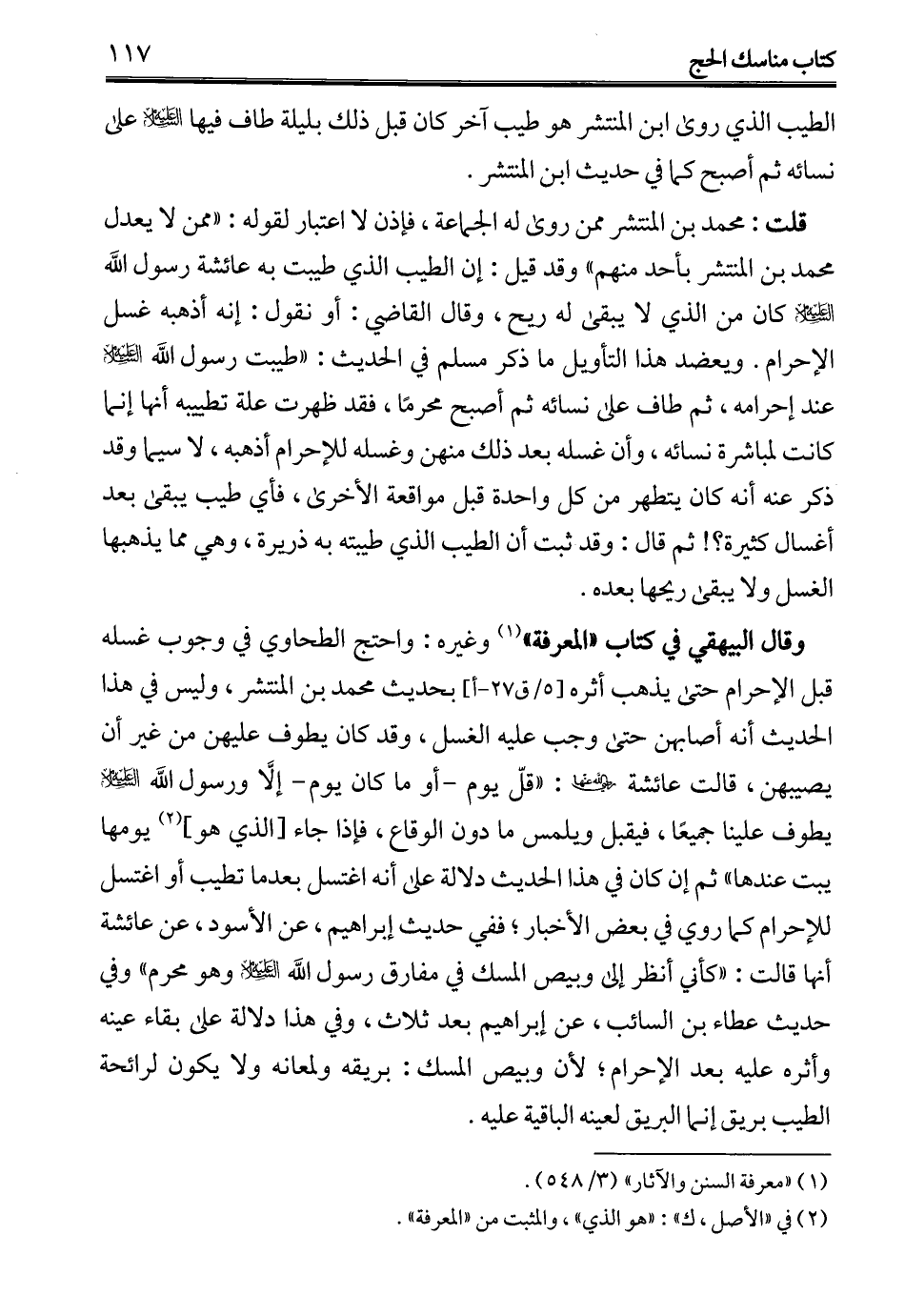 وقال البيهقي في كتاب "المعرفة" (¬1) وغيره: واحتج الطحاوي في وجوب غسله قبل الإِحرام حتى يذهب أثره بحديث محمد بن المنتشر، وليس في هذا الحديث أنه أصابهن حتى وجب عليه الغسل، وقد كان يطوف عليهن من غير أن يصيبهن، قالت عائشة -رضي الله عنها-: "قلّ يوم -أو ما كان يوم- إلاَّ ورسول الله -عليه السلام- يطوف علينا جميعًا، فيقبل ويلمس ما دون الوقاع، فإذا جاء [الذي هو] (¬2) يومها يبت عندها" ثم إن كان في هذا الحديث دلالة على أنه اغتسل بعد ما تطيب أو اغتسل للإِحرام كما روي في بعض الأخبار؛ ففي حديث إبراهيم، عن الأسود، عن عائشة أنها قالت: "كأني انظر إلى وبيص المسك في مفارق رسول الله -عليه السلام- وهو محرم" وفي حديث عطاء بن السائب، عن إبراهيم بعد ثلاث، وفي هذا دلالة على بقاء عينه وأثره عليه بعد الإِحرام؛ لأن وبيص المسك: بريقه ولمعانه ولا يكون لرائحة الطيب بريق إنما البريق لعينه الباقية عليه.