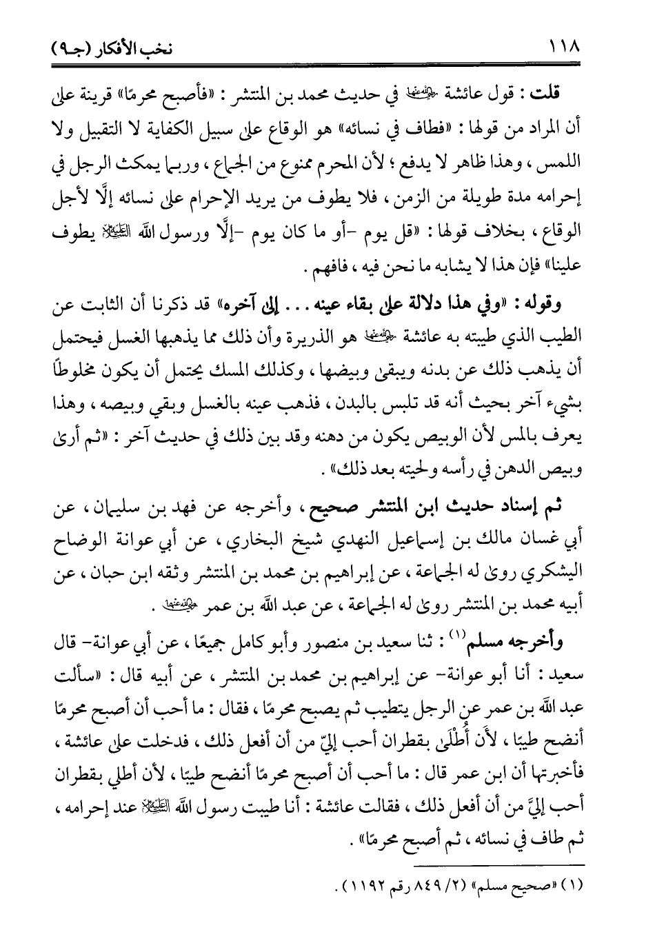 وأخرجه مسلم (¬1): ثنا سعيد بن منصور وأبو كامل جميعًا، عن أبي عوانة -قال سعيد: أنا أبو عوانة- عن إبراهيم بن محمد بن المنتشر، عن أبيه قال: "سألت عبد الله بن عمر عن الرجل يتطيب ثم يصبح محرمًا، فقال: ما أحب أن أصبح محرمًا أنضح طيبًا، لأَن أُطْلَى بقطران أحب إليّ من أن أفعل ذلك، فدخلت على عائشة، فأخبرتها أن ابن عمر قال: ما أحب أن أصبح محرمًا أنضح طيبًا، لأن أطلي بقطران أحب إليَّ من أن أفعل ذلك، فقالت عائشة: أنا طيبت رسول الله -عليه السلام- عند إحرامه، ثم طاف في نسائه، ثم أصبح محرمًا".