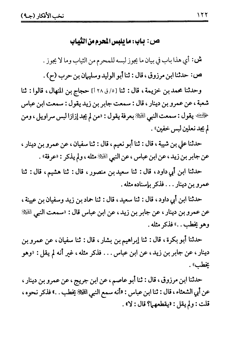 وحدثنا محمد بن خزيمة، قال: ثنا حجاج بن المنهال، قالوا: ثنا شعبة، عن عمرو بن دينار، قال: سمعت جابر بن زيد يقول: سمعت ابن عباس -رضي الله عنه- يقول: سمعت النبي -عليه السلام- بعرفة يقول: "من لم يجد إزارًا لبس سراويل، ومن لم يجد نعلين لبس خفين".
