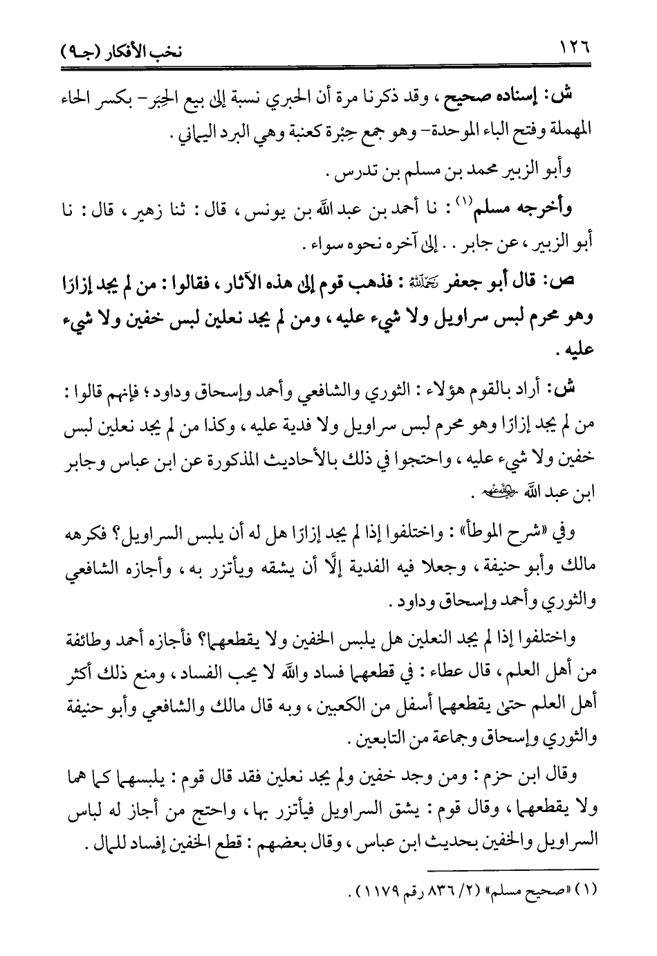 ش: أراد بالقوم هؤلاء: الثوري والشافعي وأحمد وإسحاق وداود؛ فإنهم قالوا: من لم يجد إزارًا وهو محرم لبس سراويل ولا فدية عليه، وكذا من لم يجد نعلين لبس خفين ولا شيء عليه، واحتجوا في ذلك بالأحاديث المذكورة عن ابن عباس وجابر ابن عبد الله -رضي الله عنهم-