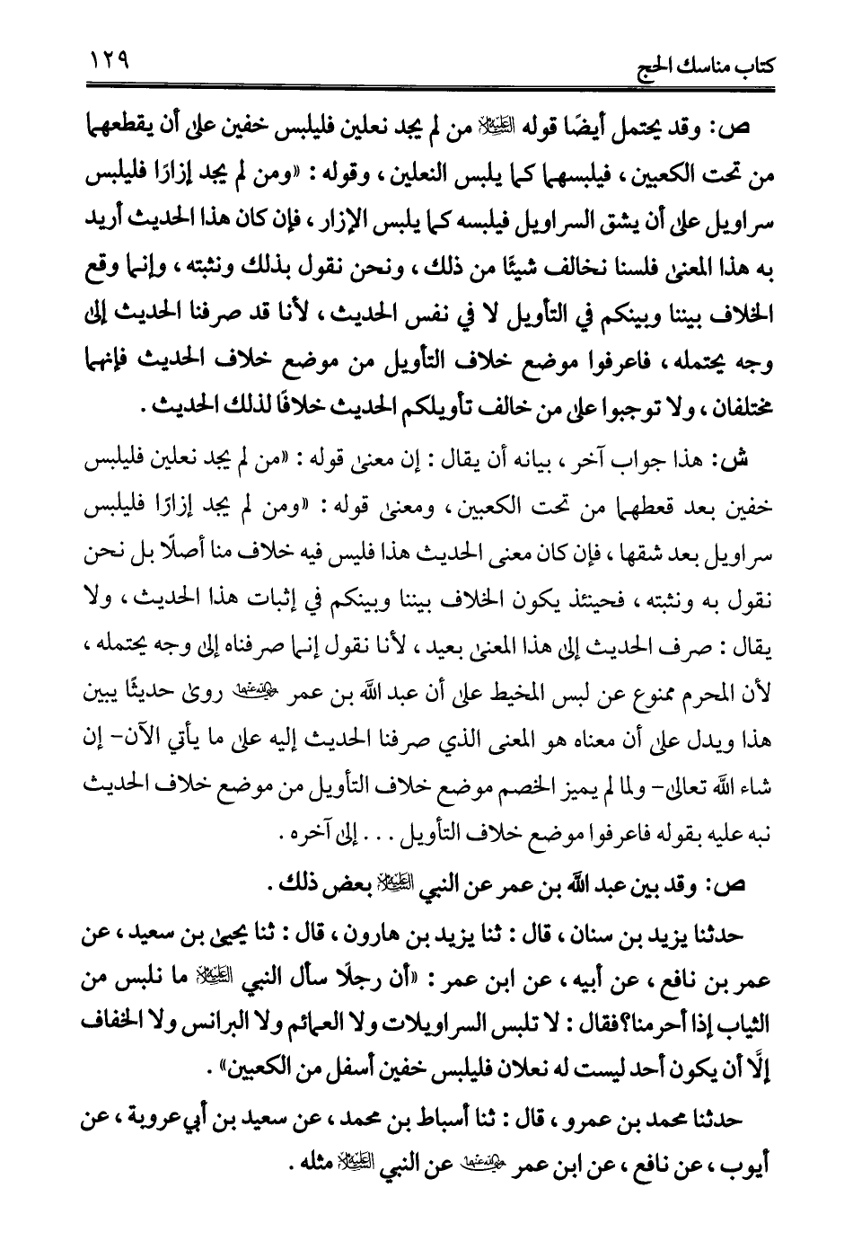 ش: هذا جواب آخر، بيانه أن يقال: إن معنى قوله: "من لم يجد نعلين فليلبس خفين بعد قعطهما من تحت الكعبين، ومعنى قوله: "ومن لم يجد إزارًا فليلبس سراويل بعد شقها، فإن كان معنى الحديث هذا فليس فيه خلاف منا أصلًا بل نحن نقول به ونثبته، فحينئذ يكون الخلاف بيننا وبينكم في إثبات هذا الحديث، ولا يقال: صرف الحديث إلى هذا المعنى بعيد، لأنا نقول إنما صرفناه إلى وجه يحتمله، لأن المحرم ممنوع عن لبس المخيط على أن عبد الله بن عمر -رضي الله عنهما- روى حديثًا يبين هذا ويدل على أن معناه هو المعنى الذي صرفنا الحديث إليه على ما يأتي الآن -إن شاء الله تعالى- ولما لم يميز الخصم موضع خلاف التأويل من موضع خلاف الحديث نبه عليه بقوله فاعرفوا موضع خلاف التأويل ... إلى آخره.