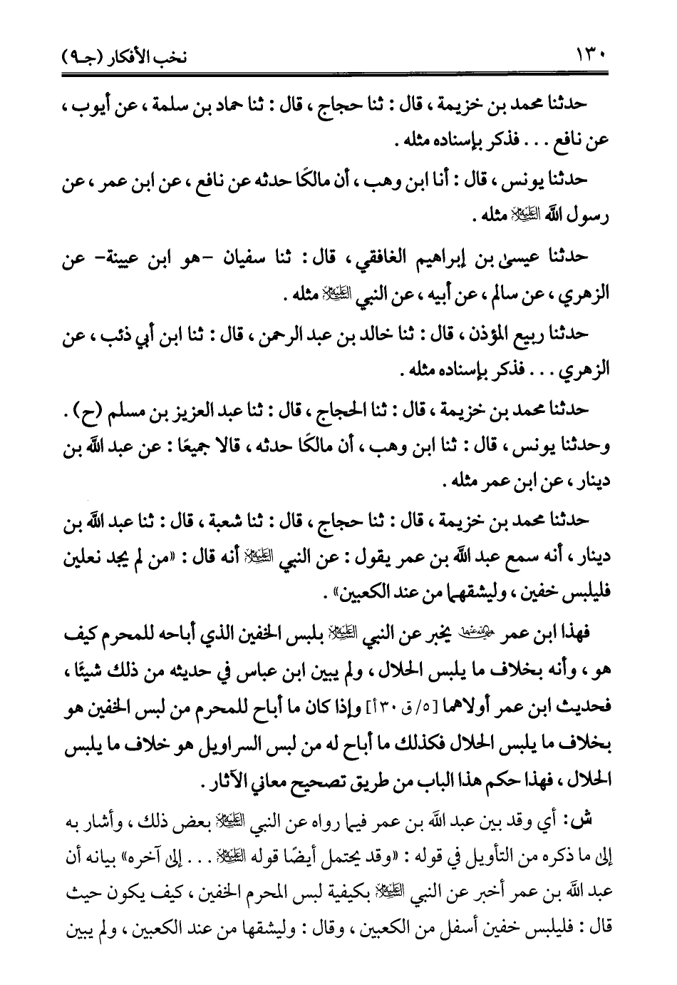 ش: أي وقد بين عبد الله بن عمر فيما رواه عن النبي -عليه السلام- بعض ذلك، وأشار به إلى ما ذكره من التأويل في قوله: "وقد يحتمل أيضًا قوله -عليه السلام- ... إلى آخره" بيانه أن عبد الله بن عمر أخبر عن النبي -عليه السلام- بكيفية لبس المحرم الخفين، كيف يكون حيث قال: فليلبس خفين أسفل من الكعبين، وقال: وليشقها من عند الكعبين، ولم يبين