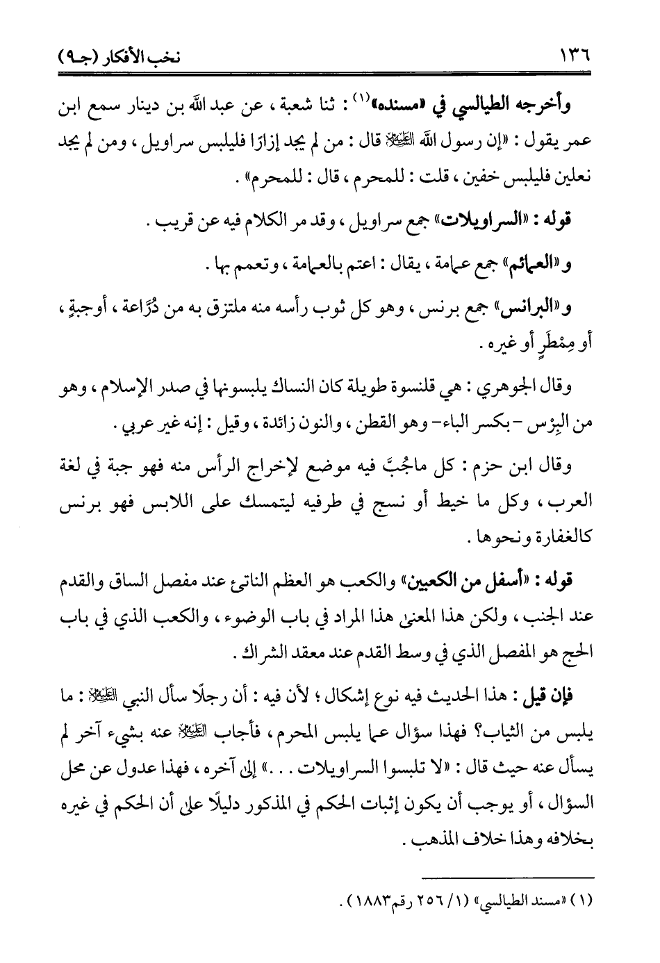 وأخرجه الطيالسي في "مسنده" (¬1): ثنا شعبة، عن عبد الله بن دينار سمع ابن عمر يقول: "إن رسول الله -عليه السلام- قال: من لم يجد إزارًا فليلبس سراويل، ومن لم يجد نعلين فليلبس خفين، قلت: للمحرم، قال: للمحرم".