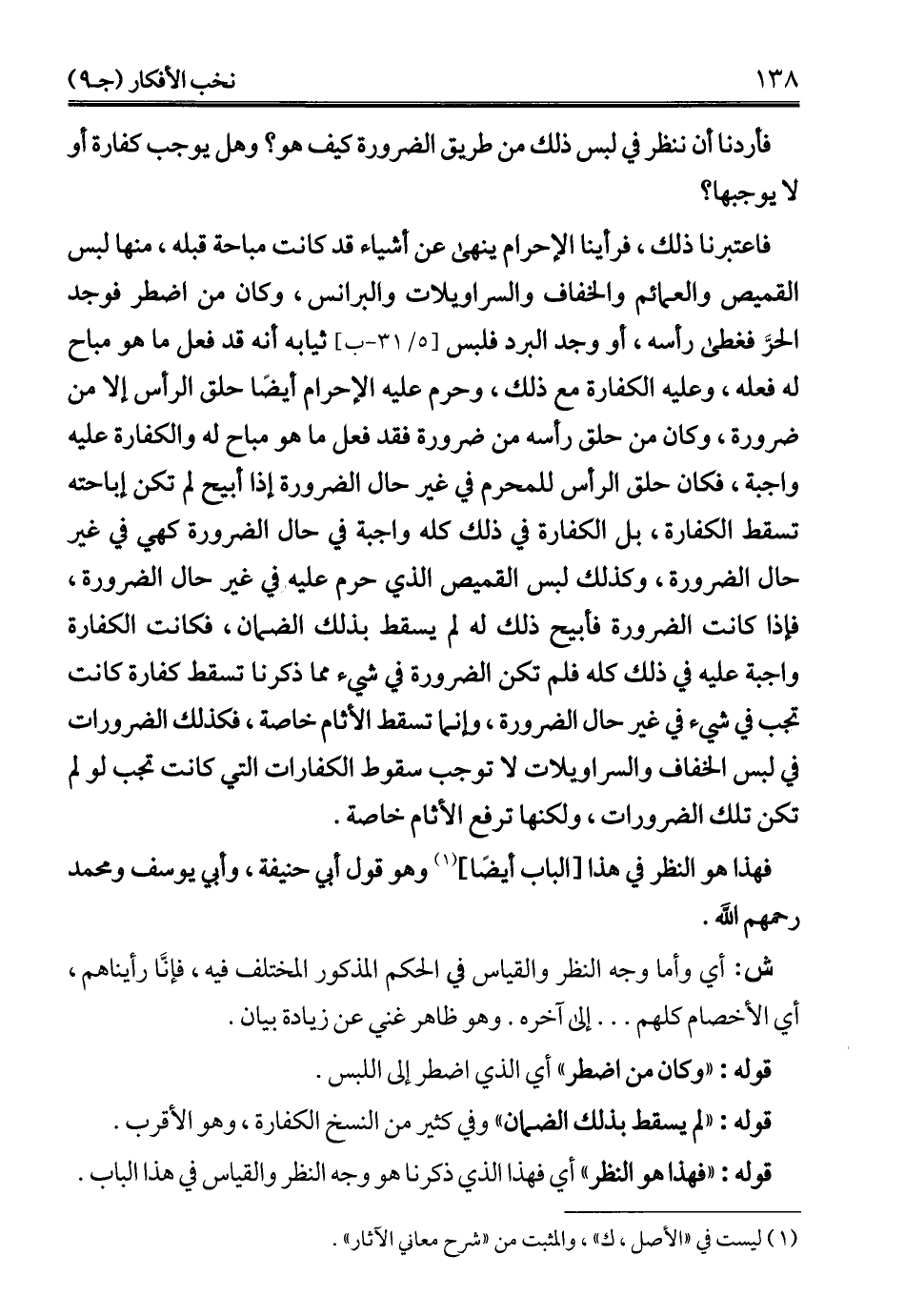 فاعتبرنا ذلك، فرأينا الإِحرام ينهى عن أشياء قد كانت مباحة قبله، منها لبس القميص والعمائم والخفاف والسراويلات والبرانس، وكان من اضطر فوجد الحرَّ فغطى رأسه، أو وجد البرد فلبس ثيابه أنه قد فعل ما هو مباح له فعله، وعليه الكفارة مع ذلك، وحرم عليه الإِحرام أيضًا حلق الرأس إلا من ضرورة، وكان من حلق رأسه من ضرورة فقد فعل ما هو مباح له والكفارة عليه واجبة، فكان حلق الرأس للمحرم في غير حال الضرورة إذا أبيح لم تكن إباحته تسقط الكفارة، بل الكفارة في ذلك كله واجبة في حال الضرورة كهي في غير حال الضرورة، وكذلك لبس القميص الذي حرم عليه في غير حال الضرورة، فإذا كانت الضرورة فأبيح ذلك له لم يسقط بذلك الضمان، فكانت الكفارة واجبة عليه في ذلك كله فلم تكن الضرورة في شيء مما ذكرنا تسقط كفارة كانت تجب في شيء في غير حال الضرورة، وإنما تسقط الأثام خاصة، فكذلك الضرورات في لبس الخفاف والسراويلات لا توجب سقوط الكفارات التي كانت تجب لو لم تكن تلك الضرورات، ولكنها ترفع الأثام خاصة.