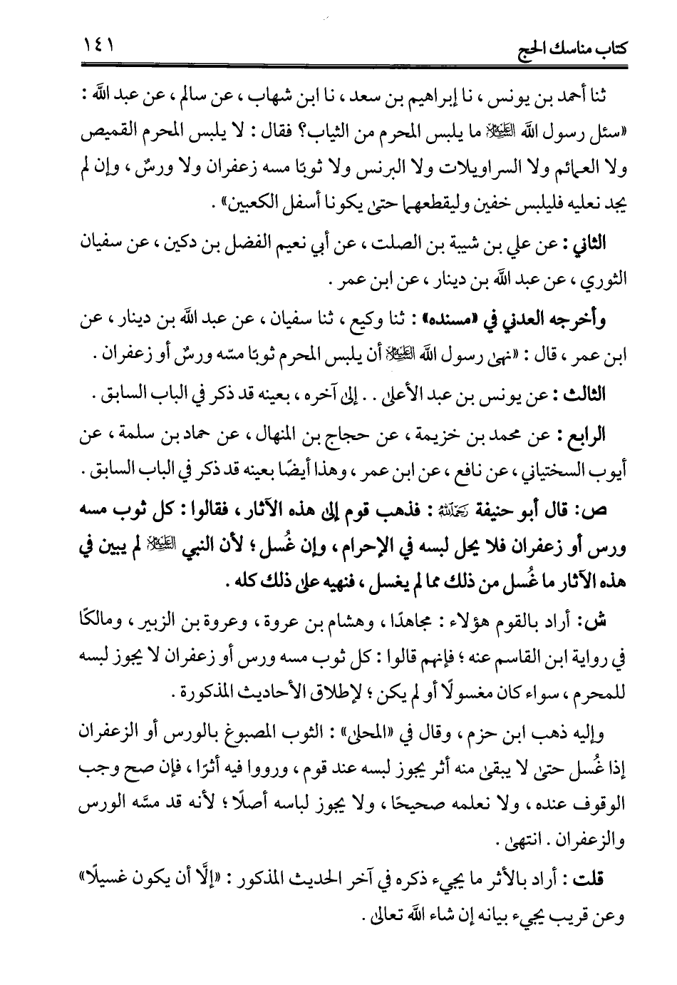 ثنا أحمد بن يونس، نا إبراهيم بن سعد، نا ابن شهاب، عن سالم، عن عبد الله: "سئل رسول الله -عليه السلام- ما يلبس المحرم من الثياب؟ فقال: لا يلبس المحرم القميص ولا العمائم ولا السراويلات ولا البرنس ولا ثوبًا مسه زعفران ولا ورسٌ، وإن لم يجد نعليه فليلبس خفين وليقطعهما حتى يكونا أسفل الكعبين".